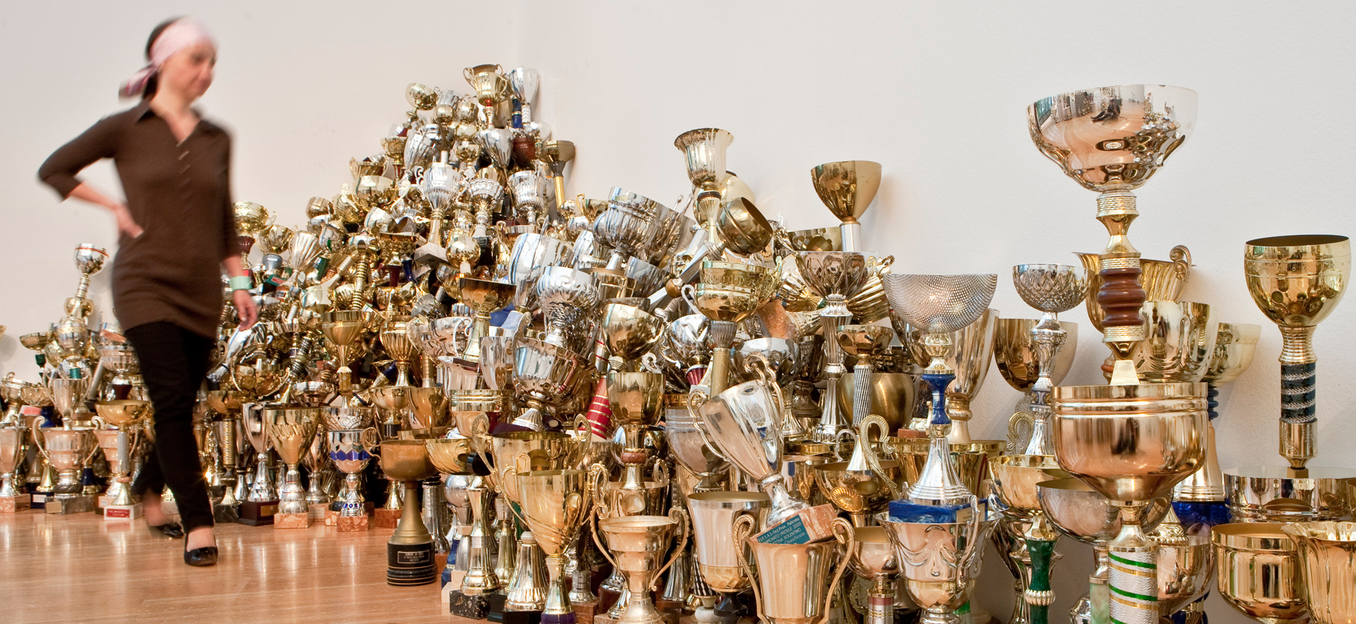 She was interested in the trophy, an object whose history reaches back to our distant cultural past and which today, awarded chiefly at sporting events, is among the everyday items of our society. Within just a few months, more than 2500 trophies were collected, cleaned, and archived. Although the trophies are contemporary mass-produced articles, each one is individualized by means of an engraving and tells a personal story that references a specific event. Triumph, Aleksandra Mir's first solo exhibition in Germany, presents this collection, and has thus become an archive of popular culture and part of contemporary history.