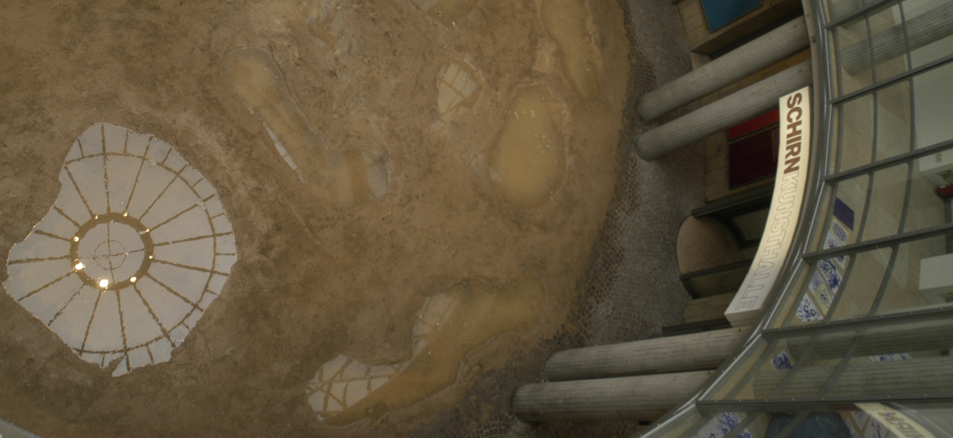 The Schirn presents “durchnässt” (“soaked”), a new work by Ayşe Erkmen, which the artist has developed specifically for the Schirn Rotunda. The project fits into the series of works by Carsten Nicolai, Elmgreen & Dragset, Jeppe Hein, Olafur Eliasson, James Lee Byars, and Costa Vece realized at this location to date. For her work, Ayşe Erkmen relies exclusively on the conditions of the location. From the circular area in front of the entrance zone of the Schirn, which is surrounded by big concrete columns, paths lead in all directions. Ayşe Erkmen’s intervention transforms this panoptic waiting area into a stage that forces us to look at the ground and suggests a choreography based on an apparently aleatory score for each step.
