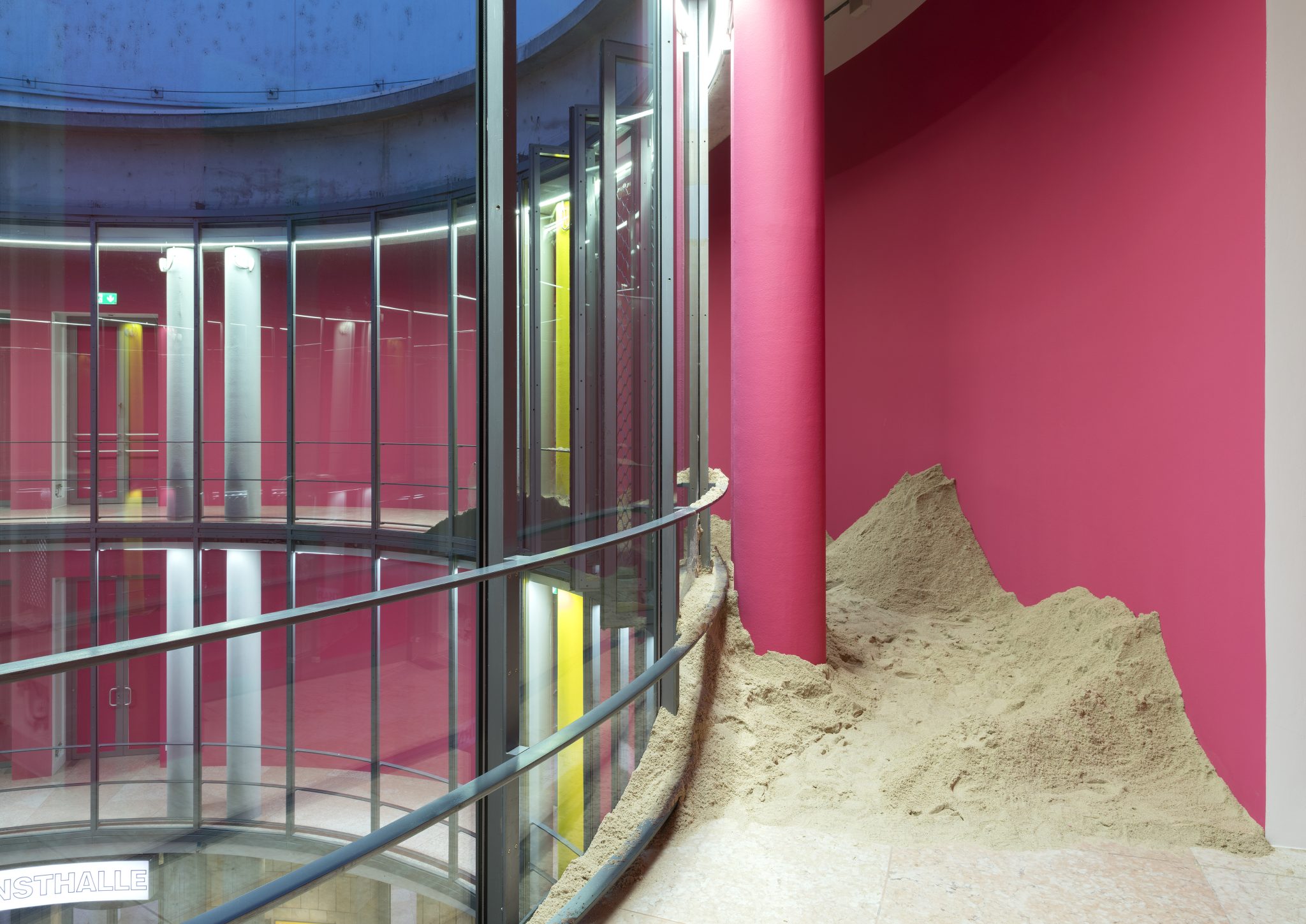 In the two opposing entrances to the Rotunda, the artist positions two aluminium sculptures that are open at the top and filled with sand. Henke guides the viewer’s gaze through a system of colors, which accentuates the architecture upwards to the open windows of the circular galleries surrounding the Rotunda. There sand is also placed and trickles outwards and into the sculptures through coarse-meshed metal rolling grills. The visitors can stroll round the galleries and walk through the sand, hence influencing the circulation as well. At the same time, from up there the form of the objects in the Rotunda becomes visible: they are two oversized eyes. The association of sand in the eye—an unpleasant feeling involving discomfort and pain—suggests itself.