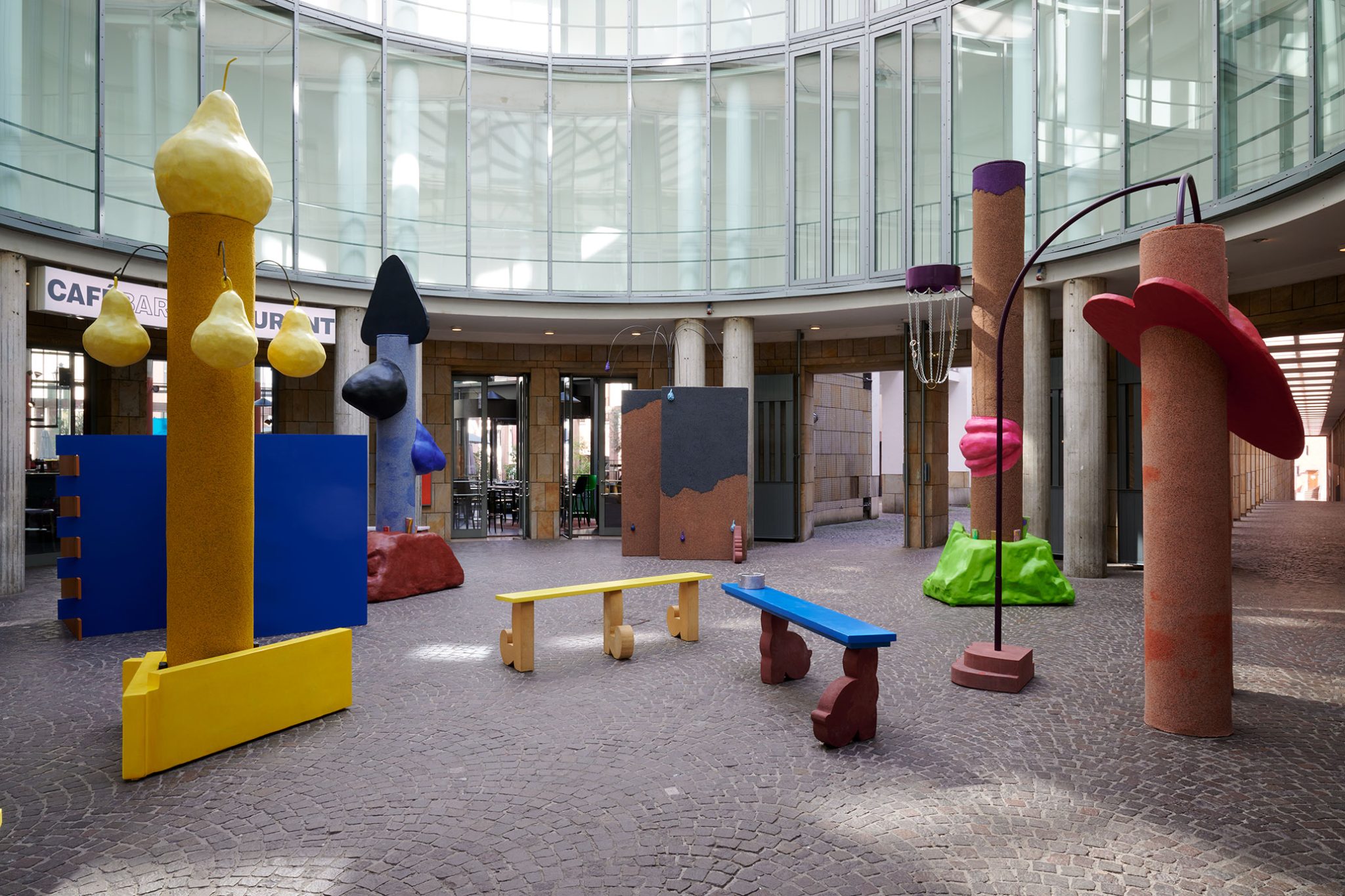 Who builds what, where, and for whom? Influenced by architectural history, Maruša Sagadin (b. 1978) examines the social aspects upon which a building or place is based. Her artistic work operates at the interface between private and public spaces and combines elements from architecture, sculpture, and painting. Sagadin employs humor and exaggeration in both her language of form and use of color to reveal mechanisms of inclusion and exclusion and to break with established codes of art observation. In a playful and subversive manner, her works refer to elements of pop and subculture and applied art. In the interaction between gender, language, and sculpture, they subvert existing norms and thematize sculpture as a form of visualization. On the occasion of Slovenia’s presentation as guest of honor at the Frankfurt Book Fair 2023, the artist is realizing new works in the Rotunda of the SCHIRN which responds to the specific characteristics of this semipublic space.