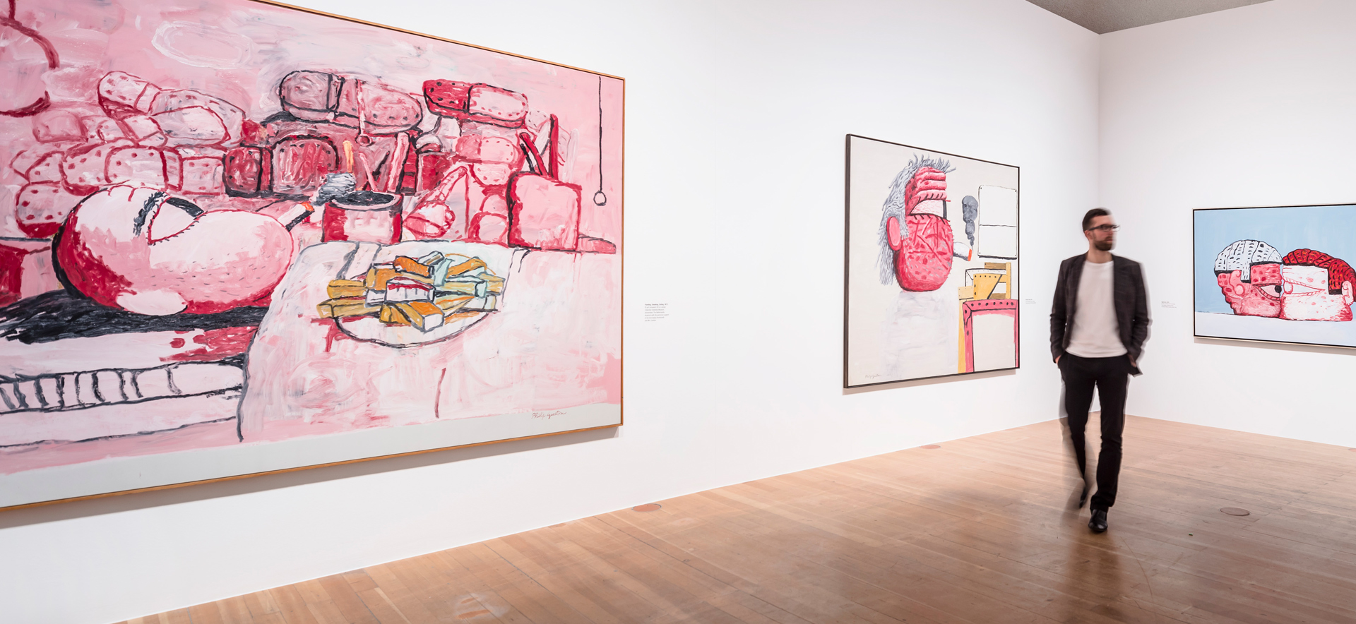 The courageous and quite extraordinary oeuvre of US painter Philip Guston (1913--1980) was one of the most controversial of the age. He was the first painter to return to figuration in the post-War era and was quite pioneering in linking high art and images from popular culture, so that today many celebrate him as the trailblazer of postmodern, figurative painting. In 1950, though self-taught Guston earned his spurs in the New York art world as defined by Jackson Pollock, Willem de Kooning and Mark Rothko, and emerged as one of the major champions of Abstract Expressionism. At the end of the 1960s, he embarked on an intense phase of drawing, something that culminated in his breaking away in painting from the "purity" demanded of abstract art: Guston introduced coarse figures and fragments of figures into his works; they populate his pink, red, black and blue canvases, smoking, drinking, and not infrequently painting. Large heads, severed hairy legs, clumsy shoes, and all manner of architectural fragments such as walls, doors, and lamp bulbs are among Guston's themes, which are reminiscent of 1920s comics. The first exhibition of these paintings, with their anarchic sense of humor and feel for the grotesque, was in 1970 and caused a veritable scandal, as many critics accused him of "betraying" abstract art. To mark the 100th anniversary of his birth, the SCHIRN is honoring Philip Guston with an exhibition boasting a concentrated selection of some 40 works from what was his most exciting period, showing how they form a milestone in American painting.