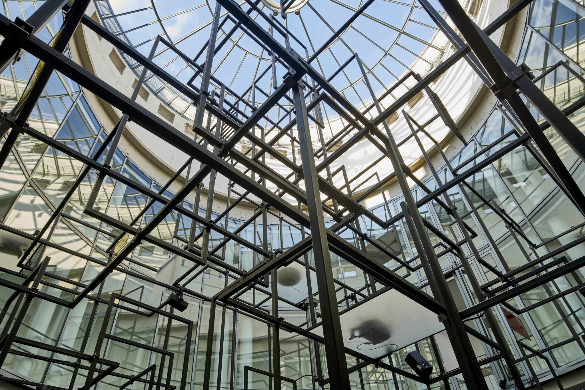 With her films, sculptures and printed editions, the Italian-German artist Rosa Barba (*1972) has created a conceptual work of poetic density. In this installation created specifically for the Schirn, in which she responds to the openly accessible public setting of the rotunda, Barba combines the artistic media of film and sculpture. Inside the rotunda, she has erected an expansive, geometrically intricate steel construction consisting of some 80 serial framework elements. The work is twelve meters tall and nearly fills the entire lobby of the Schirn. Rosa Barba uses the installation as the stage for a dynamic choreography combining visual imagery, light, and sound. The artist also cites a selection of her own works, which are presented here in a new constellation.