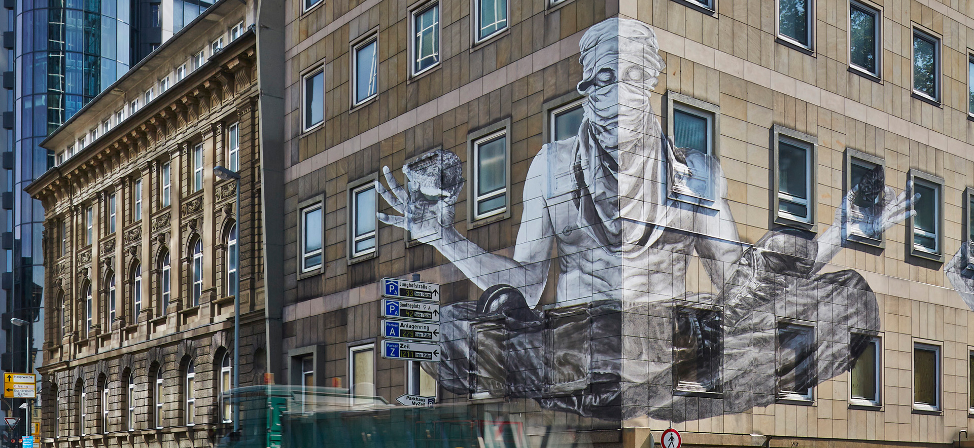 The major cities of Brazil are home to one of the world’s most vital and fascinating graffiti scenes. In terms of both content and aesthetic quality, this colourful, dynamic and unique movement differs significantly from the American and European street-art scenes. Brazilian street art stands apart from the globalized graffiti culture by virtue not only of the specific political and social climate in a country rocked by profound upheavals but also because of the incredible abundance of styles and techniques it encompasses. Eleven artists and artist groups from São Paulo and other Brazilian cities have been invited to exhibit their paintings in urban settings throughout Frankfurt, and thus to alter the everyday image of the city. Their works include figurative and abstract, light-hearted and socially critical paintings ranging from oversized murals to unpretentious, ephemeral signs and symbols.