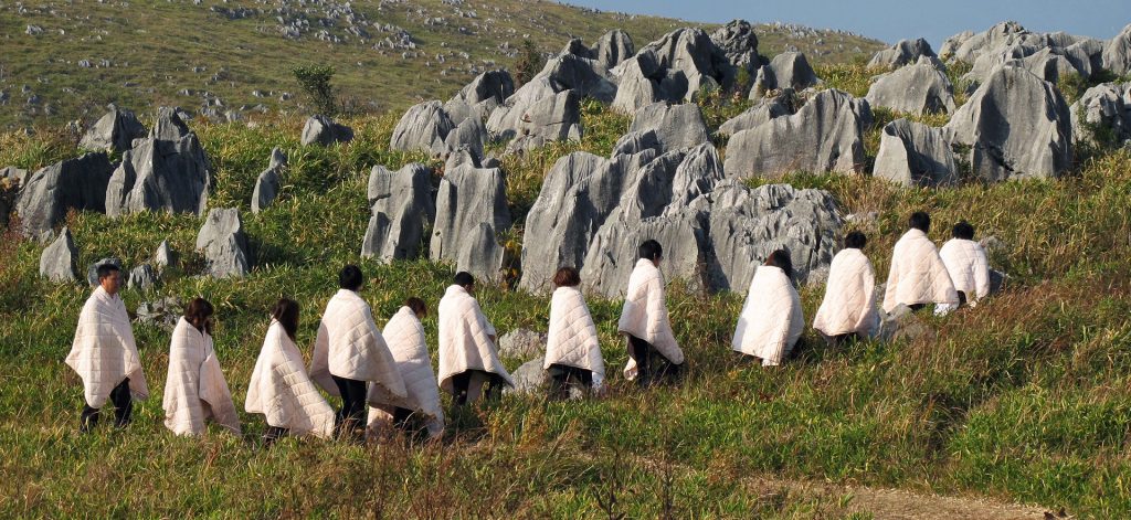 Hiwa K recounts his flight as a child from Iraqi Kurdistan to Rome by retracing part of the route on foot. On the bridge of his nose and forehead, he balanced a pole fitted with bicycle, car, and motorcycle mirrors, symbolizing how his identity has become fragmented into many roles. Tiffany Chung also addresses migration in her multimedia works. Through the cartographic drawings of “Global Refugee Migration Project”, she reflects on the ever-increasing displacement of people by recording migration routes and the number of arrivals, as well as those who have died or gone missing. A video work shows a uniformed human chain moving through an epic landscape, their synchronized walk taking on the appearance of a ritual.