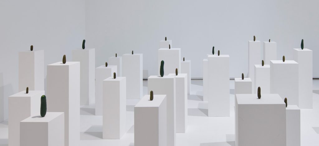 Asked about his work, the artist says: “Rather like potatoes, cucumbers are an age-old non-shape. There are millions of different cucumbers. No cucumber is the same as the next, rather like people. That appeals me a great deal.”