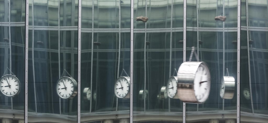 Vom 26. März bis 14. Juni 2015 zeigt die Schirn Kunsthalle Frankfurt die von der Berliner Künstlerin Alicja Kwade eigens für die Rotunde entwickelte Installation „Die bewegte Leere des Moments“. Diese lässt Raum für subjektive Wahrnehmung und Assoziation. Eine Bedrohung ist beinahe körperlich spürbar. Oder ist es vielmehr ein Gefühl der Unsicherheit, der Verwirrung, das einen beschleicht? An der Deckenmitte der öffentlich zugänglichen Rotunde ist ein Motor mit einem Kreisgewinde befestigt. An einer Kette hängt ein Stein mit ca. 30 cm Durchmesser, der bis zur oberen, zweiten Etage reicht. Gegenüber ist auf Höhe der unteren, ersten Etage der Rotunde eine großflächige, beidseitige analoge Uhr mit ca. 50 cm Durchmesser angebracht. Beide Objekte rotieren um die Mittelachse des zylinderförmigen Raumes und spiegeln sich unentwegt in der mit Spiegelfolie verkleideten Fensterfront der Architektur.