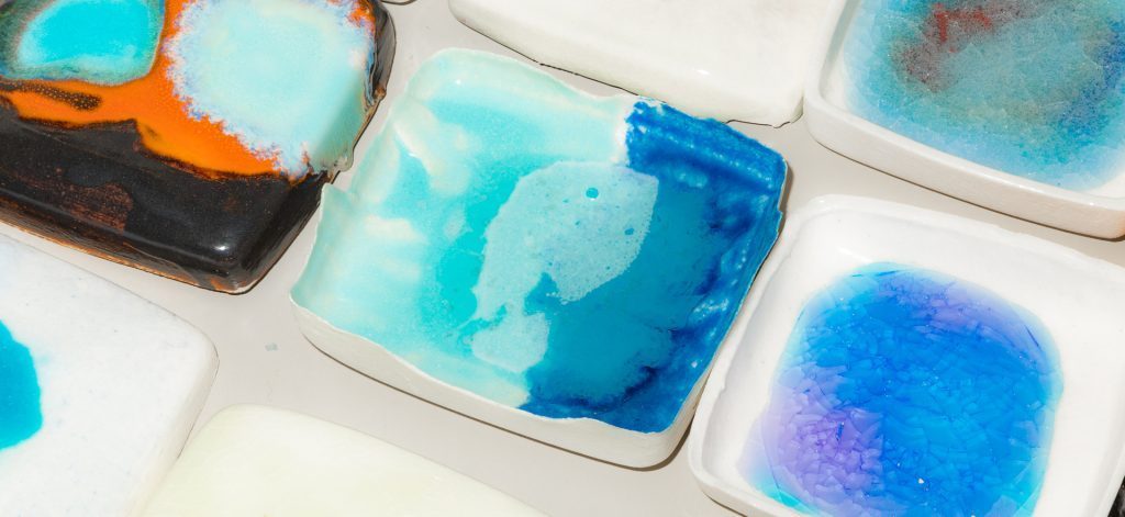 Die große Hitze, die bei unserem Besuch in Frankfurt herrscht, ist Baumann übrigens durchaus willkommen: „Sie sorgt dafür, dass mein Gips schneller trocknet“, freut er sich. Insgesamt 48 Gipsplatten bilden die Hintergrundfläche für ein abstraktes Wandrelief, das Baumann bei einer Ausstellung zu Ehren des befreundeten Künstlers Michael Beutler bald im Oldenburger Kunstverein zeigt. Auf die derart verkleidete Wand hängt er dann vergleichsweise kleinformatige Keramikreliefs, die teilweise Variationen desselben Musters wie die Gipsplatten aufweisen: eine Waffelstruktur, wie man sie von jener Sorte Wellpappe kennt, mit der Weinflaschen bruchsicher verpackt werden.