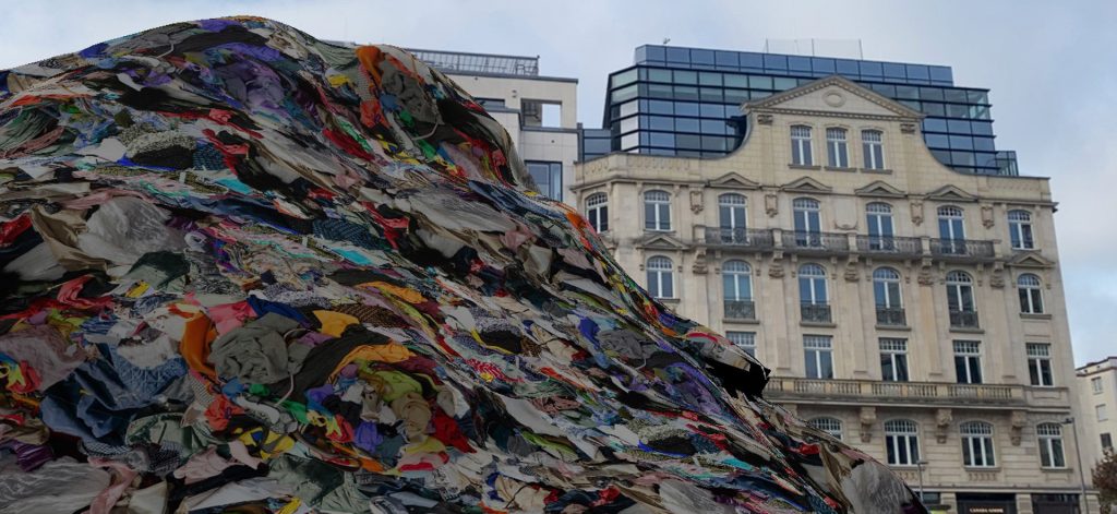 „Augmented Bahnhofsviertel“ zeichnet sich durch die Helligkeit und Brillanz der gezeigten AR-Arbeiten aus. Ein riesiger Altkleiderhaufen ragt unter dem Titel „Frankfurt Fashion Movement Kleiderberg" am Rathenauplatz in den Himmel und nimmt praktisch den gesamten Bildschirm des Smartphones ein. Es entsteht der Eindruck einer Pyramide, einer Art Shopping-Kults. Bemerkenswerterweise befindet sich der gigantische Altkleiderberg direkt vor dem Eingang der weltberühmten Designerläden, für die Menschen normalerweise in der Schlange stehen. War die Wahl des Ortes ein Zufall? Würde es einen Unterschied machen, wenn es sich nicht um eine virtuelle, sondern um eine reale Installation handeln würde? Die Antwort auf diese Frage ist höchstwahrscheinlich, dass eine solche Installation außerhalb der Grenzen eines Smartphones nicht existieren könnte. Ein gutes Beispiel dafür ist eine andere monumentale Altkleideransammlung, diesmal jedoch in physischer Form, die dieses Jahr auf der Documenta fünfzehn präsentiert wurde: „Return to Sender" von The Nest Collective. Anders als der virtuelle Altkleiderberg steht „Return to Sender" nicht vor einem Tempel der Konsum- und Wegwerfgesellschaft, den man für den Textilmüll in Teilen verantwortlich machen könnte – und dies führt zu einem der größten Potenziale von AR: Augmented Reality ermöglicht riesige Ausstellungen im öffentlichen Raum und kritische Kommentare zur unmittelbaren Umgebung, wie sie in physischer Form kaum möglich wären, aktuell jedoch in den AR-Installationen in Frankfurt bemerkt werden können.