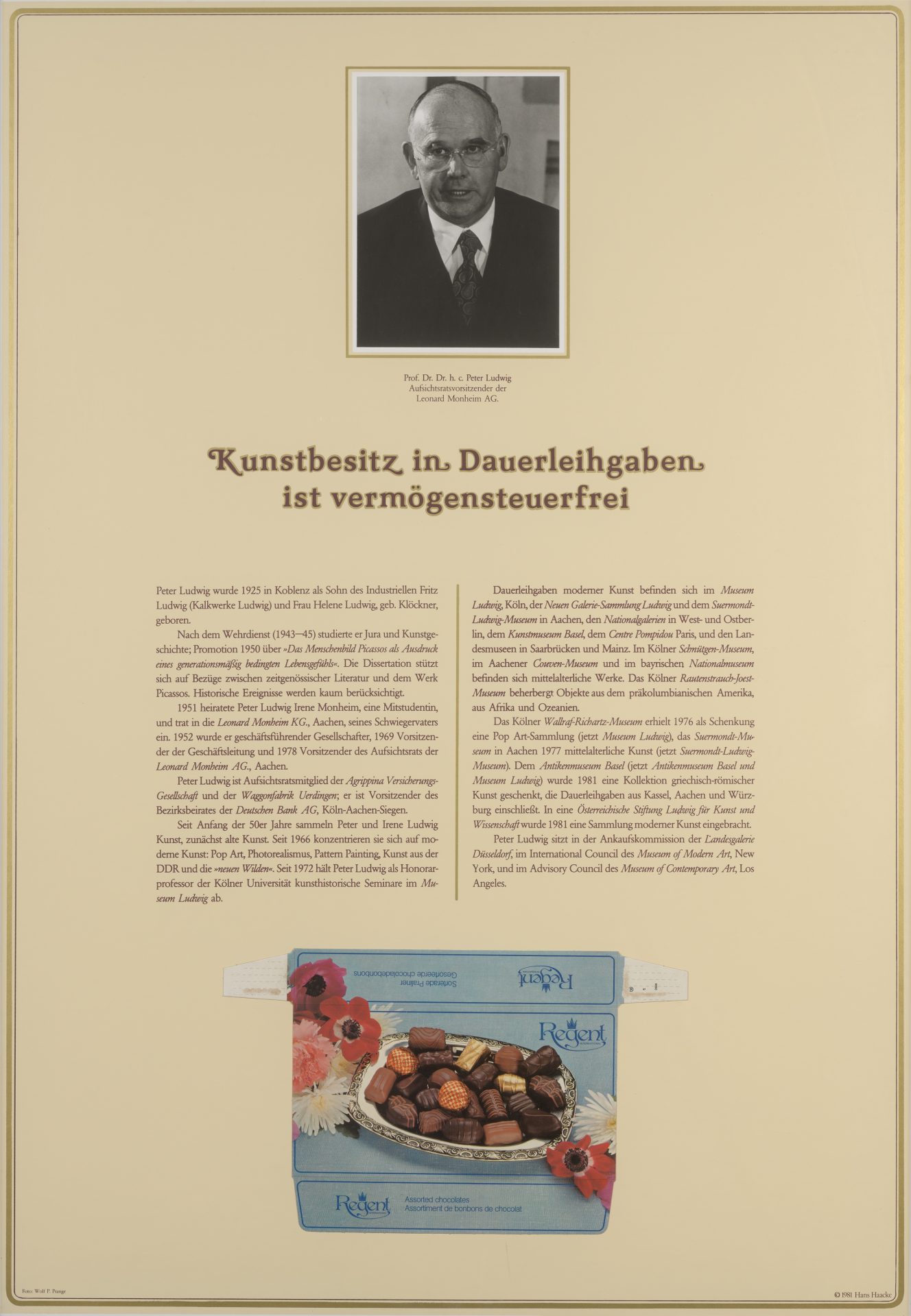 Zu einer weiteren institutionellen Absage führte das „Manet-PROJEKT ’74“ (1974), das Haacke für die Jubiläumsausstellung des Wallraf-Richartz-Museums in Köln einreichte. Er schlug vor, das „Spargel-Stilleben“ (1880) von Édouard Manet aus der Sammlung des Museums zusammen mit den Ergebnissen einer Provenienzrecherche zu diesem Werk auszustellen. Die Informationstafeln beinhalten detaillierte, sowohl persönlich-biografische als auch beruflich-wirtschaftliche Angaben zu den Vorbesitzern sowie deren Verwicklung in den Nationalsozialismus. Die SCHIRN zeigt zwei weitere Arbeiten, die sich kritisch mit den Wechselbeziehungen von Kunstmäzenatentum und ökonomischer Aktivität auseinandersetzen: „Der Pralinenmeister“ (1981), eine Arbeit zu Verbindungen zwischen kultur- und steuerpolitischen Entscheidungen des einflussreichen Kölner Sammlers und Fabrikanten Peter Ludwig, und „Buhrlesque“ (1985) zum Schweizer Kunstsammler, Mäzen und Waffenproduzenten Dr. Dietrich Bührle.