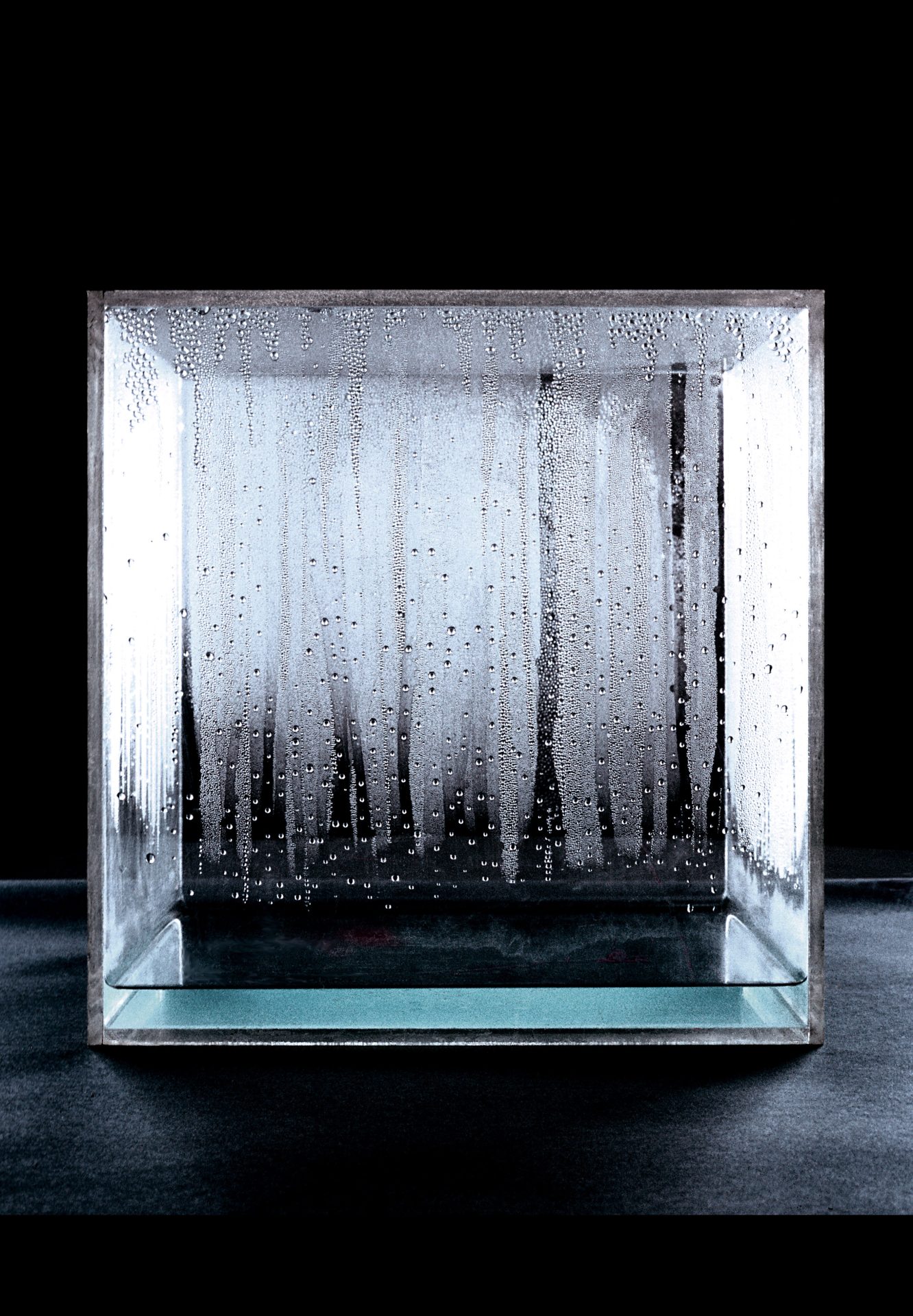 Zu sehen ist zudem eine Reihe von Werken, in denen sich Haacke mit den verschiedenen Aggregatzuständen von Wasser beschäftigte. Ein „signature work“ des Künstlers ist der „Large Condensation Cube“ (1963–1967), ein Plexiglas-Kubus, in den eine kleine Menge Wasser eingeschlossen ist. Haacke nannte diese Kuben auch „Wetterkästen“, später verglich er das meteorologische Klima auch mit dem politischen „Klima“. Diese Verknüpfung von verschiedenen Systemen ist charakteristisch für seine Arbeitsweise. Auch zeichnet sich in seiner künstlerischen Praxis hier der Übergang vom Objekt (oder der Skulptur) zum Prozess ab. Weitere „Versuchsanordnungen“ im musealen Innenraum führen mittels Verdunstung, Kondensation, Kristallisation, Verflüssigung den Wasserkreislauf („Circulation“, 1969) vor, andere Luftbewegungen („Blaues Segel“, 1964–1965) oder Wachstumsprozesse („Grass Grows“ / „Gras wächst“, 1969). Ab 1967 arbeitete Haacke auch im Außenraum, etwa mit „Sky Line“ (1967), sowie mit von ihm gesteuerten Prozessen mit Wasserdampf oder schmelzendem Schnee, und dokumentierte diese Arbeiten selbst fotografisch.
