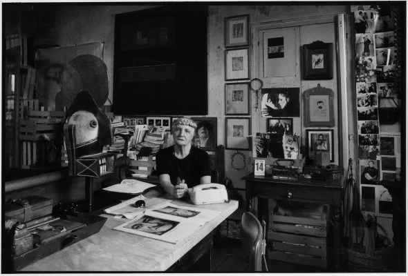 Carol Rama war keineswegs eine Außenseiterin. Ein Blick auf die unzähligen Fotos in ihrem Studio offenbart die inspirierenden sozialen Kreise, in denen sich die Künstlerin bewegte: Neben einer Vielzahl bekannter Persönlichkeiten aus der italienischen Kunst- und Intellektuellenszene wie dem Architekten und Designer Carlo Mollino oder Komponisten Luciano Berio, ist auch Man Ray zu sehen. Die eigenwillige Künstlerin pflegte eine besondere Freundschaft mit dem berühmten surrealistischen Fotografen. Die vielen Gespräche, Briefe und gemeinsamen Reisen beeinflussten ihre künstlerische Entwicklung maßgeblich und wechselseitig.