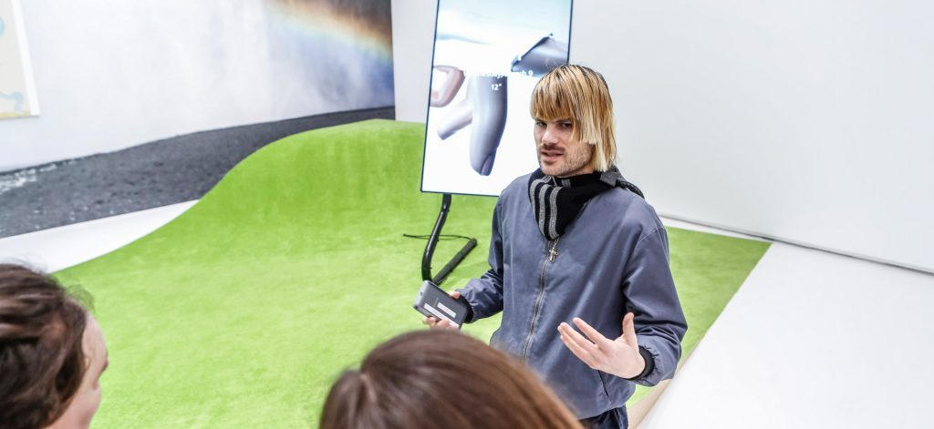 Künstler Florian Meisenberg umgeben von seiner Arbeit "Out of Office" in der Ausstellung "ICH", Foto: Schirn Kunsthalle Frankfurt, Norbert Miguletz, 2016