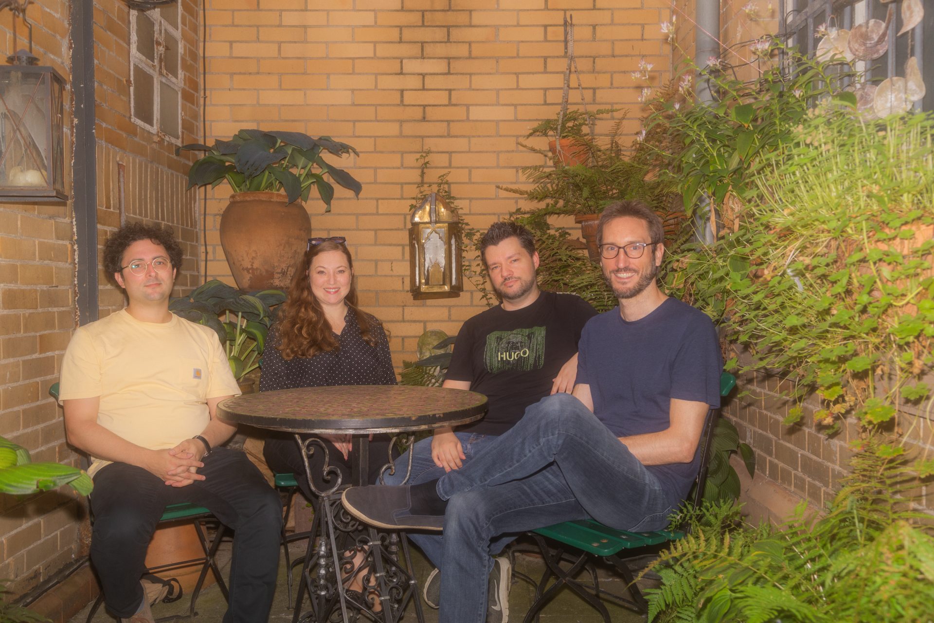 Für zwei sonnige Mittagsstunden sind wir zu Gast im Hotel Nizza in der Elbestraße. Wer eintreten will, muss vorher klingeln. In der Lobby ordern wir Getränke, die wir auf einem Tablett auf die kleine, mit vielen Grünpflanzen ausgestattete Dachterrasse in den fünften Stock balancieren, die wir heute ganz für uns alleine haben. Es ist auf unspektakuläre Weise schön und beinahe idyllisch hier oben. Der Blick streift über die Backsteinbauten des Bahnhofsviertels. Den Hintergrund bilden die Wolkenkratzer der Skyline. Das stilvolle Haus gilt als Künstler*innenhotel und ist besonders in der Kulturszene beliebt. Felix Fischl, Sebastian Schwittay, Svetlana Svyatskaya und Gary Vanisian, die vier Mitglieder des Filmkollektivs Frankfurt, quartieren hier regelmäßig internationale Regisseur*innen und andere Gäste ein, die zu den von ihnen kuratierten Filmreihen anreisen. Auch als Büroersatz für Arbeitstreffen haben sie das Hotel, in Ermangelung eigener Räume, schon oft genutzt.