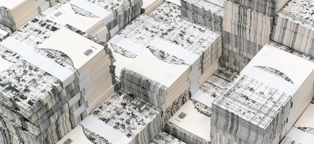 Doch wer einen aufmerksamen Blick auf die Banknoten des Konzeptkünstlers wirft, erkennt, dass er nicht nur Zahlen auf dem Papier platziert hat, sondern auch Satzfragmente. Auch wenn diese so klein skaliert sind, dass man sie beinahe nur als grafische Linien erkennt, ist diese Textebene der wesentliche Kern der Arbeit, indem sie die vollständige E-Mail Korrespondenz zwischen Michael Riedel und seiner New Yorker Galerie von 2009 bis 2017 abbildet. Der Ausstellungstitel „Geldmacher“ bekommt somit, neben dem Verweis auf das produzierte Kunstgeld Riedels, noch eine weitere Dimension.