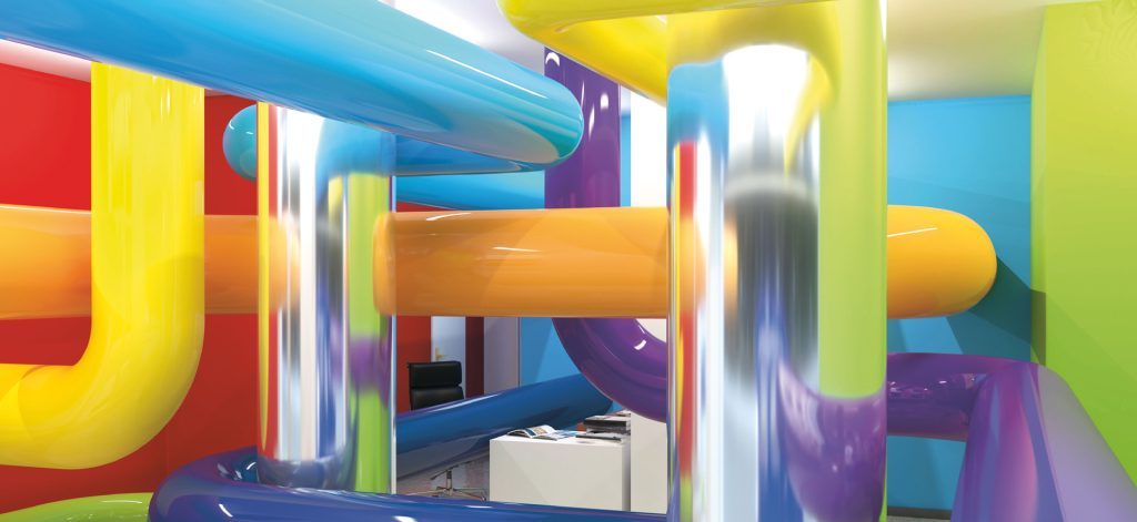 Falls es im White Cube Rohre gibt, sind sie garantiert nicht zu sehen, denn in den heiligen Hallen des Kunstbetriebs sind die Wände maximal neutral. Die Kunst soll ablenkungsfrei dastehen. Manuel Roßner geht mit seiner Ausstellung “Ultralight Beam” gegen die Logik der weißen Wand vor, zumindest virtuell und im “1822-Forum” der Frankfurter Sparkasse. Ohne die Virtual Reality-Brille sind in dem Raum nur zwei silberne Säulen zu sehen, mit der Virtual Reality-Brille finden sich die Besucher inmitten von bunten Rohren wieder.