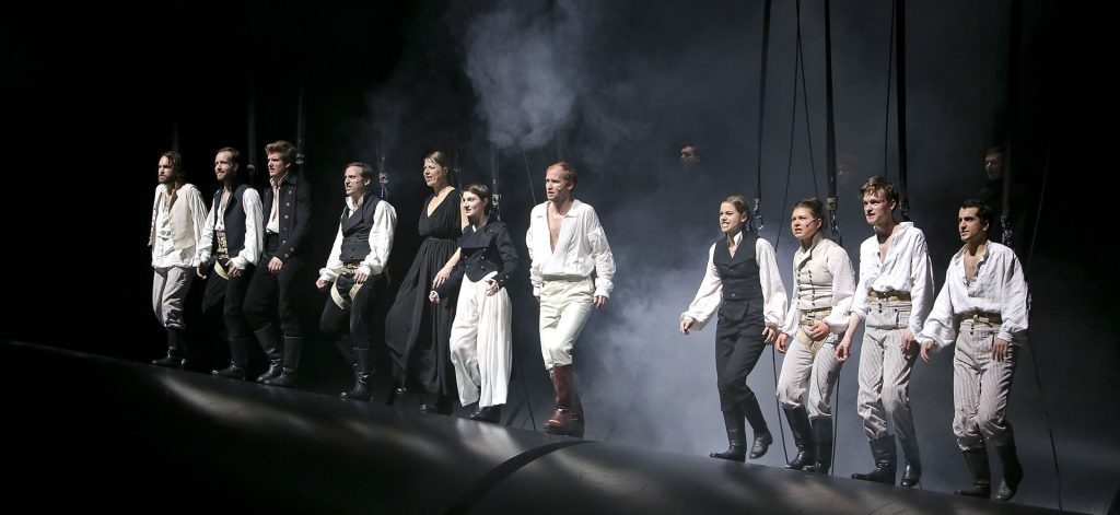 Die sich drehenden Rollen sind ein starkes Bild. Sie stehen für den oft unheilvollen Lauf der Geschichte, der sich nicht bremsen lässt. Sie stehen dafür, wie der Aufbruch zum Mahlwerk wird. Und während man auf sie blickt, hat man eines immer im Kopf: Wer jetzt aus der Reihe tanzt, der kommt unter die Räder. Es ist beachtlich, wie den Darstellern das wackelige Spiel auf den Rollen glückt, man malt sich aus, wie erschöpft sie nach dieser Tortur sein müssen. Nico Holonics spielt einen diabolischen Robespierre, eine Gruselfigur. Torben Kessler gibt den Danton erst hadernd, dann mutig. Vier Musiker sind mit auf der Bühne, sie spielen Cello, Gitarre und Bass. Drei Sänger bewegen sich mit auf den Rollen. Die Musik von Ari Benjamin Meyers pendelt zwischen Minimalismus und wuchtigem Postrock. Sie ist in dieser beeindruckenden Inszenierung ein wichtiges, bestimmendes Element.