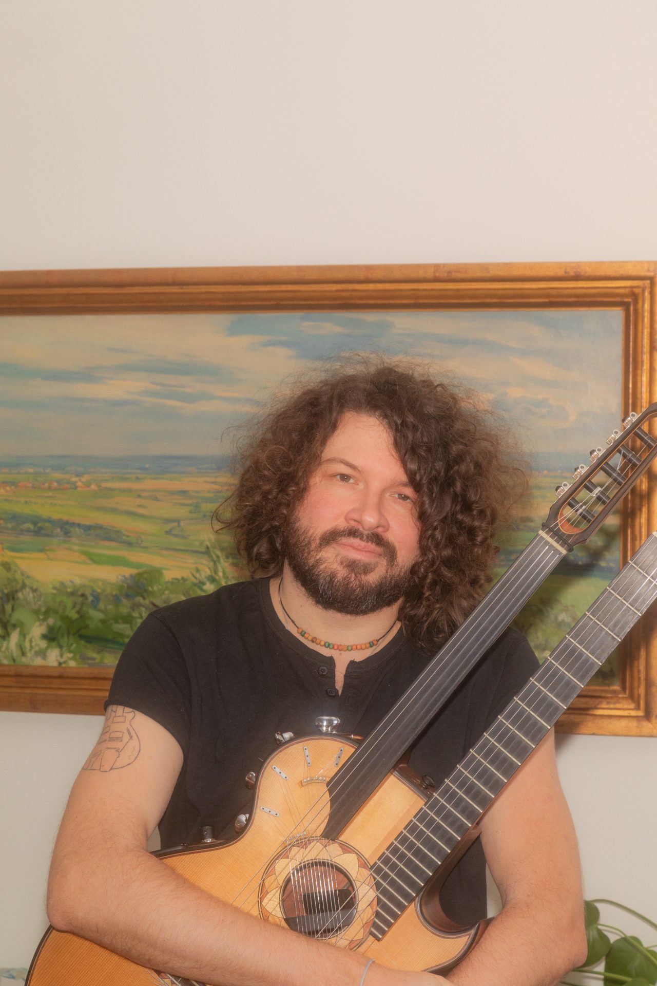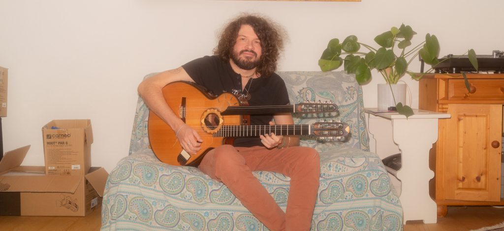 „Farben und Klänge gehören zusammen“, sagt Clouth, der inzwischen Musiker geworden ist, wie ein Blick in sein Arbeitszimmer verrät. Hingucker im Raum sind zwei Doppelhalsgitarren, die er zusammen mit dem Instrumentenbauer Philipp Neumann entworfen hat. Das obere Griffbrett ist bundlos. Der Klang, den es erzeugt, erinnert an den einer arabischen Oud. Außerdem stehen hier ein Schlagzeug, ein E-Piano und eine Heimorgel. Teppiche an den Wänden und Schaumstoffplatten unter der Decke sorgen für die richtige Akustik. „Ich bin ein Nachtarbeiter“, verrät Clouth. „Die besten Ideen kommen mir so gegen ein Uhr, was schon zu kleineren Scharmützeln mit den Nachbar*innen geführt hat.“