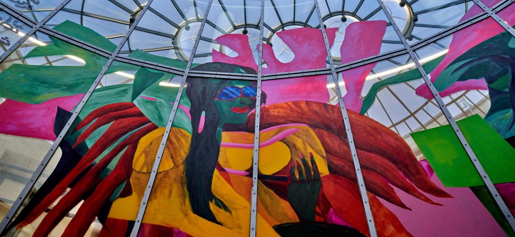 Und auch die Malerin Amna Elhassan, deren Werke zurzeit auf der Glasfassade und im ersten Obergeschoss der Rotunde zu sehen sind, wurde von der langen Geschichte und den seit 2018 anhaltenden Protesten nachhaltig geprägt. Ein Gespräch mit der aus ihrer Nachbarschaft stammenden Ahlam Khidir war ein einschneidendes Erlebnis für die Künstlerin. Khidir wurde als Mutter der Revolution bekannt, nachdem ihr Sohn Ha’zaa Hassan 2013 bei einem Protest umgebracht wurde. Nach seinem Tod begann ihr politisches Engagement und sie vernetzte sich mit den jungen Demonstrant*innen. Von Khidirs Erzählungen stark berührt, wollte auch Elhassan den Frauen der Revolution und den getöteten Demonstrant*innen ein Denkmal setzen. Sie ist die erste afrikanische Künstlerin, die die Rotunde der Schirn Kunsthalle gestaltet. Auch sie selbst schreibt also Geschichte.