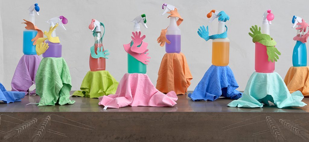 Sie verbirgt jedoch nicht, dass die in Wiesbaden gezeigte Arbeit mehrere Vorläufer hat. Die sich selbst umarmenden Reinigungsmittelflaschen hat sie in Originalgröße unter dem Titel „You Have Great Potential“ in Kassel präsentiert. Getrocknete und dadurch gehärtete PVA-Schwämme dienten dort als Sockel für die Flaschen. Die Schwämme wirken leicht, als würden sie schweben. Kneip Velescu hat das Material nach der Ausstellung nicht weggeworfen, sondern im Haushalt und in ihrer Kunst (wieder-)verwendet.