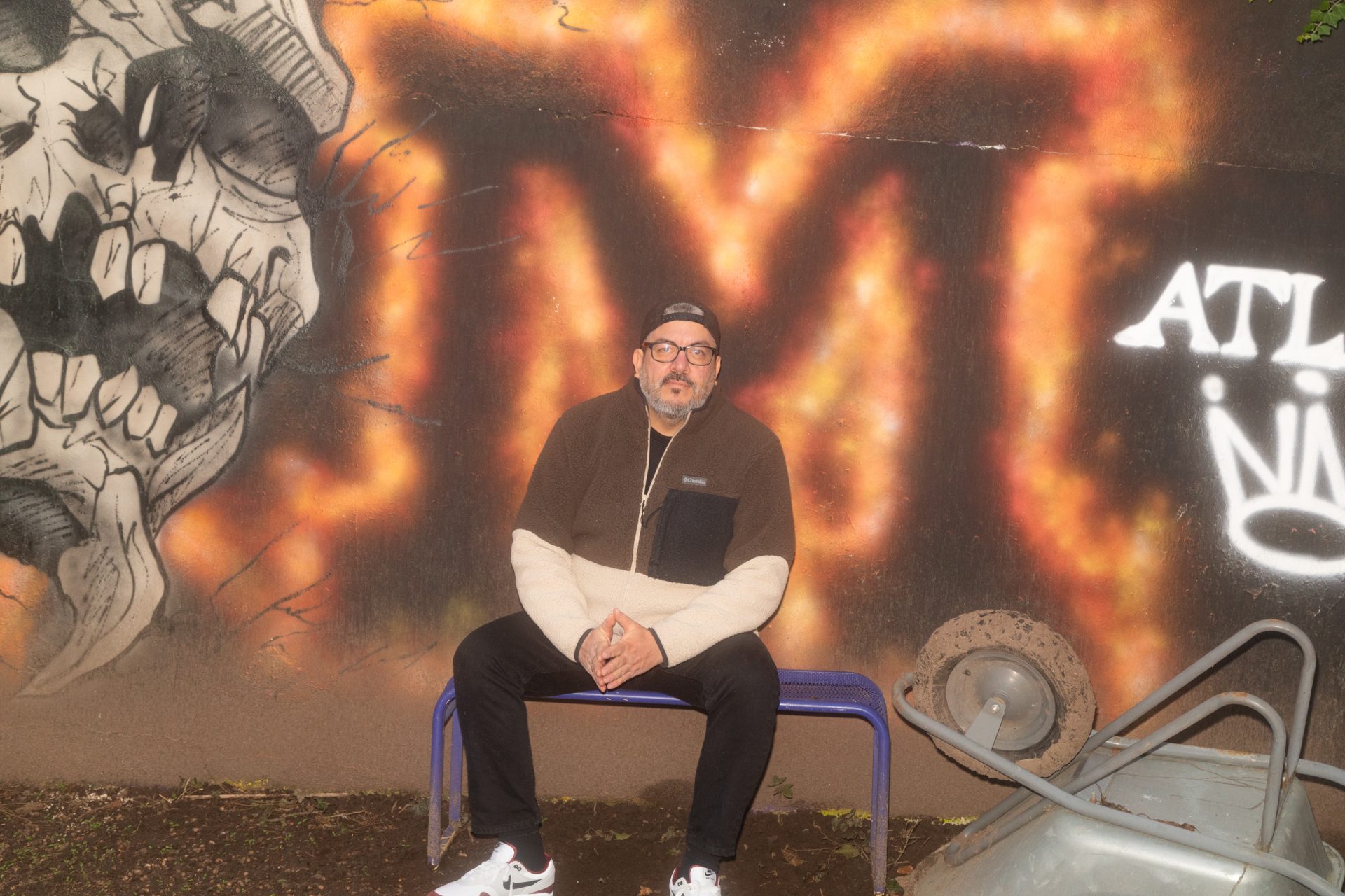 „Graffiti war für mich immer schon mehr als ein Hobby“, sagt er. „Es hat aber über zwanzig Jahre gedauert, bis ich daraus einen Beruf gemacht habe.“ Nach dem Abi begann er eine Ausbildung zum Werbekaufmann. „Bald habe ich gemerkt, dass es nicht meiner Vorstellung von Kreativität entspricht, Logos kleiner und größer zu machen. Weil ich immer schon ein Faible für Schrift und Sprache hatte, bin ich schließlich Texter geworden.“ Nach jahrelanger Arbeit für verschiedene Agenturen machte er sich 2018 selbständig. Zunächst begab er sich unter das Dach des Künstlerhauses Atelier Frankfurt, in dem er noch heute einen Raum hat. 2023 richtete er sich hier auf dem Gelände in Oberrad ein. Fuego wohnt mit seiner Familie gleich um die Ecke. „Ein Glücksfall“, sagt er – auch wenn der Mietvertrag für das „Studio Fatal“ auf zwei Jahre befristet ist.