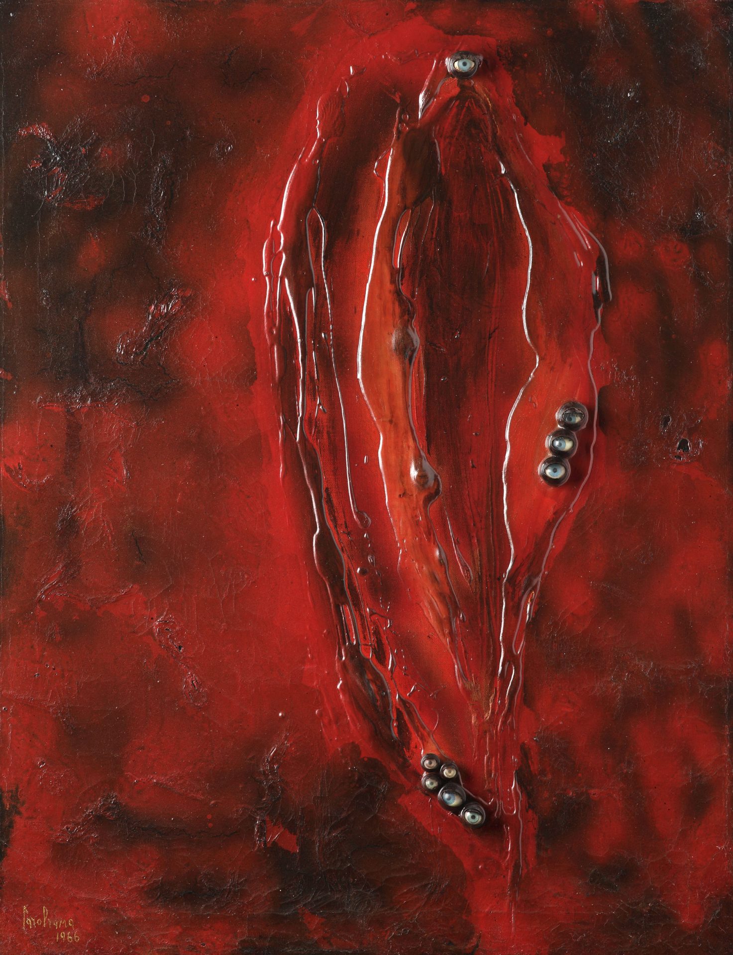Carol Rama, Presso il pungente promontorio orientale (Nahe der schroffen östlichen Landspitze), 1967, Tusche, Klebstoff und Puppenaugen auf Leinwand, 36,5 x 24,5 cm