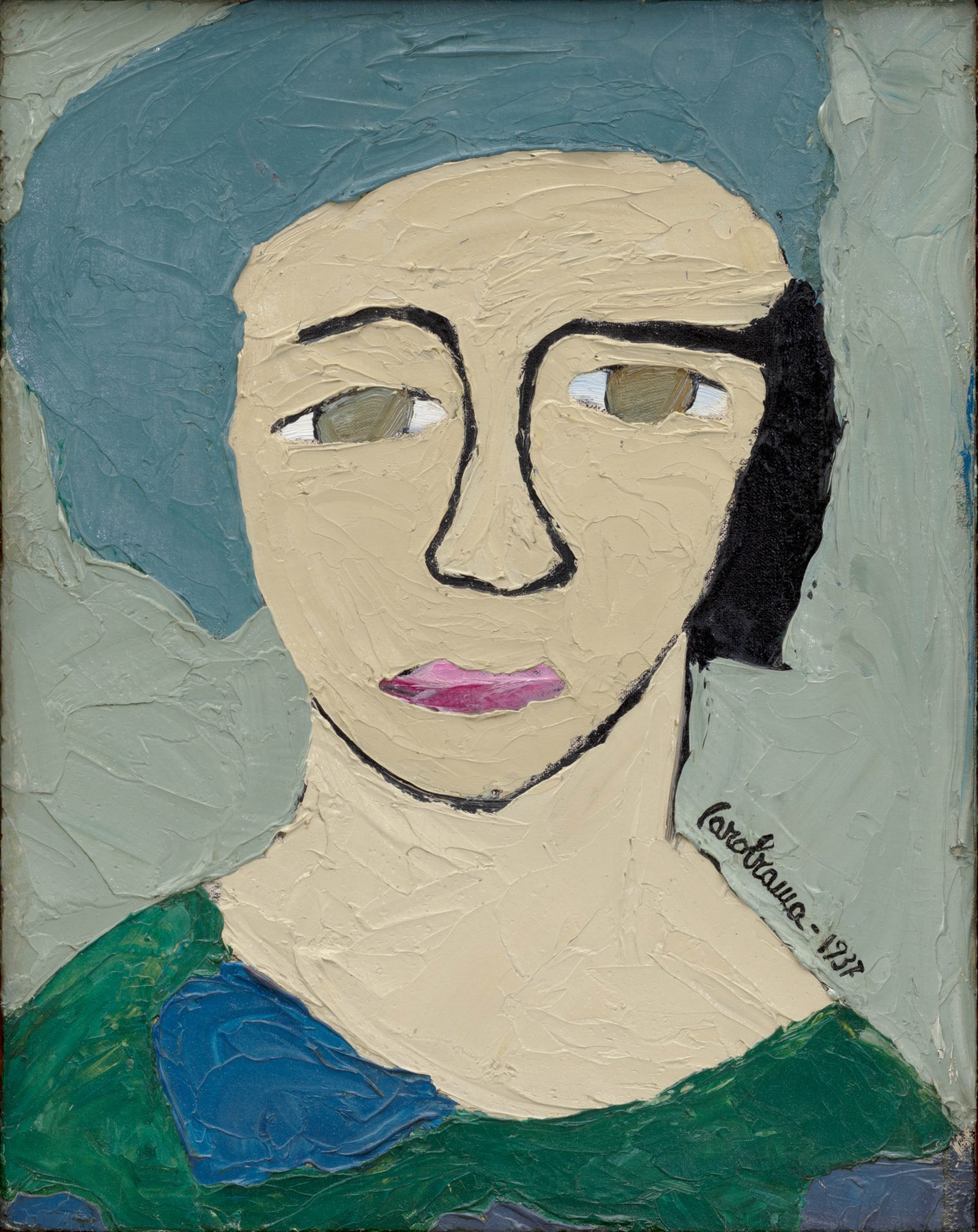 Carol Rama, Senza titolo (Autoritratto) (Ohne Titel [Selbstbildnis]), 1937, Öl auf Leinwand auf Holz, 35 x 29 cm