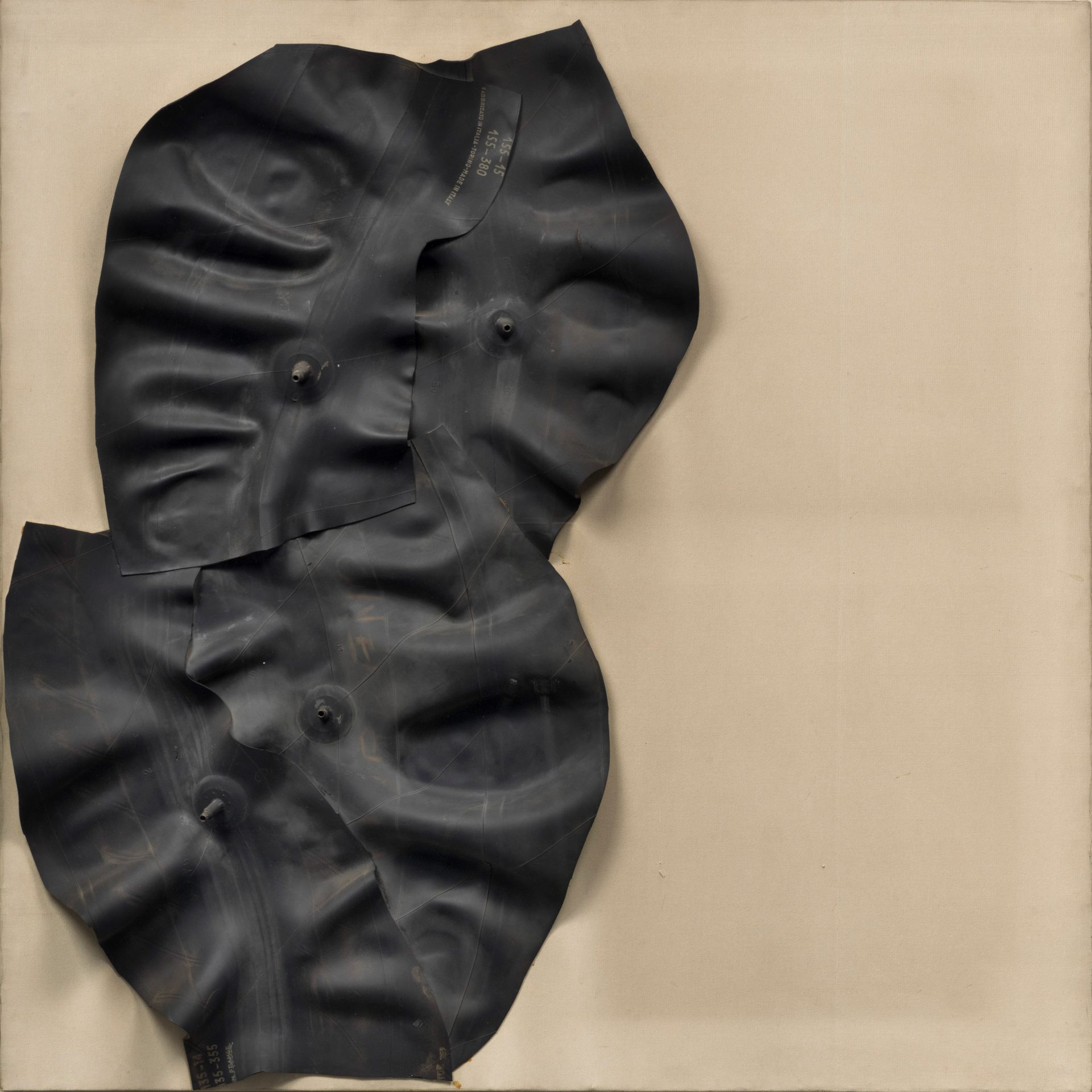 Carol Rama, Autorattristatrice n. 10 (Wortspiel mit auto und rattristrare, traurig machen), 1970, Reifenschläuche auf Leinwand, 100 × 100 cm