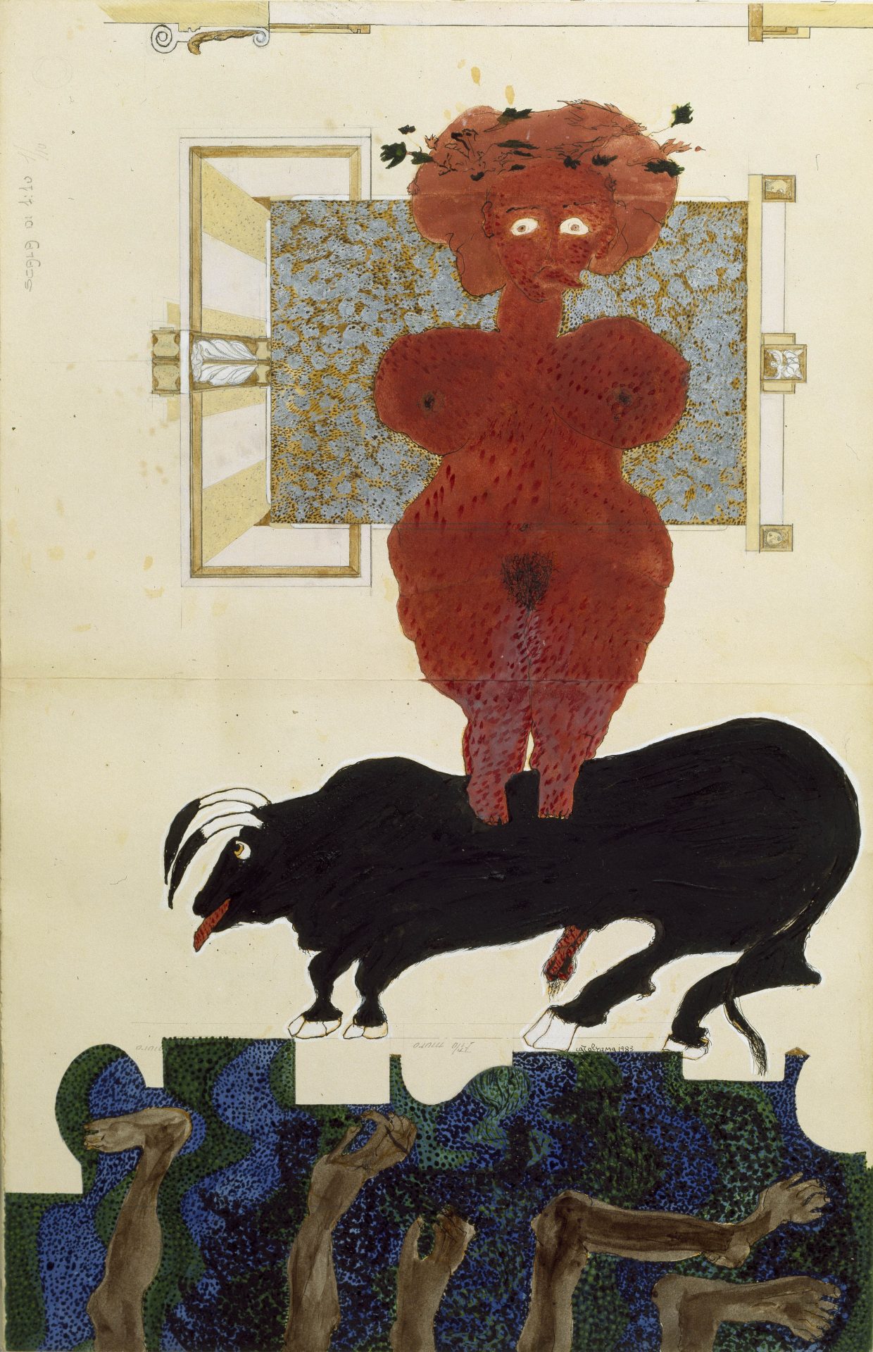 Carol Rama, Lo specchio di Huguette (Huguettes Spiegel), 1983, Mischtechnik auf bereits beschriebenem Papier (Architekturzeichnung), 49,5 × 32 cm