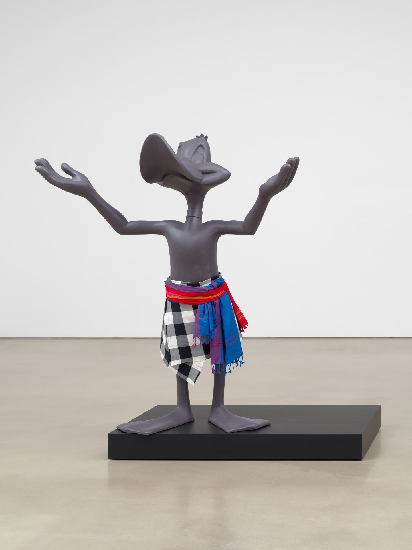 Als Schlüsselfigur ihres Werks begleitet die Comic-Ente Daffy Duck das Publikum wie ein Leitmotiv durch die Ausstellung in der SCHIRN. Kennzeichnend für die kampflustige lispelnde Nervensäge Daffy ist ihr egoistischer, geltungssüchtiger und unerschütterlicher Charakter. Obwohl sie immer wieder scheitert, gibt sie sich nie geschlagen, sondern steht auf und macht weiter. In der Serie „Open Your Shirt Please 1–9“ von 2019 kämpft Daffy Duck gegen das mächtige Schwarz, das ihn aus dem Bild zu drängen droht. Unverdrossen erscheint er jedoch immer wieder auf der Bildfläche. In den jüngsten Textilarbeiten wie „Kalt Modern Teuer“ sowie „Emporkömmling“ und „Social Climber“ (alle 2023) zeigt sich der Antiheld mit neuem Selbstbewusstsein. Die Skulptur „Church of Daffy“ (2023) im letzten Raum der Ausstellung präsentiert ihn schließlich wie einen Propheten mit erhobenen Händen und im karierten Lendenschurz. Doch ist er schon so nah an den Rand seines Podests getreten, dass er zu fallen droht. Daneben steckt in „Blame Shifting“ (2020) eine ganze Gruppe von Bugs Bunnys kopfüber in einer Mülltonne.