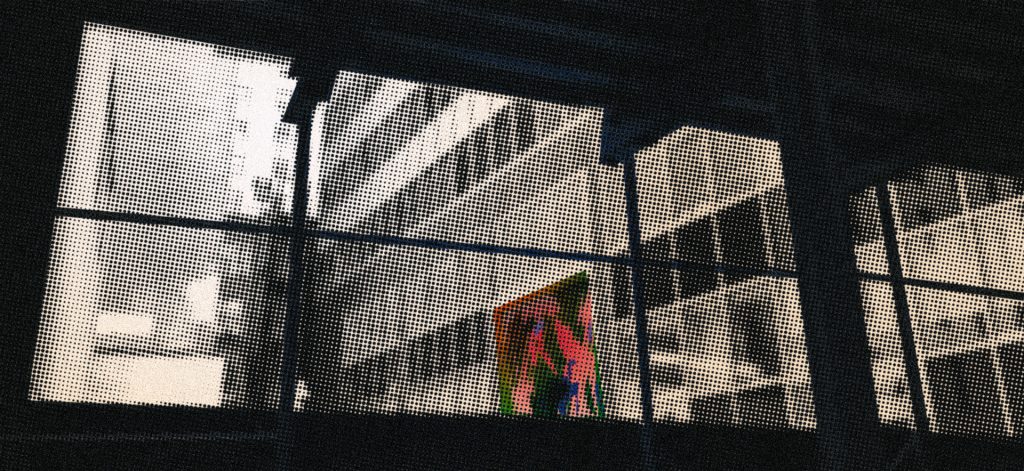 Nachdem ich die U-Bahn am Bowling Green verlassen habe, gehe ich an den National Archives at New York City vorbei zum Bürogebäude 2 Broadway. Eigentlich sollte dort ein 20 Meter breites und 3,60 Meter hohes Mosaikbild direkt über dem Haupteingang prangen, aber ich kann es nicht sehen. Auf den zweiten Blick entdecke ich es dann hinter einem Gerüst und einem grünen Bauzaun aus Holz. Hellgrüne, leuchtend blaue, mattrote und schwarze Glasstücke fügen sich zu großen, spitzen, an Scherben erinnernde Formen. Obwohl das Wandbild fast ganz von Baugerüsten verdeckt ist, beeindruckt es trotzdem durch seine schiere Größe.