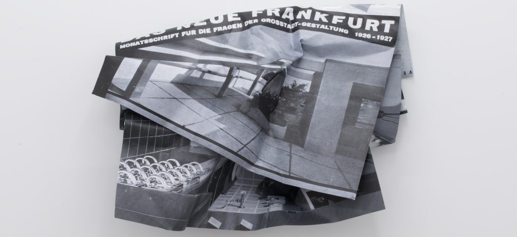 Eine andere Arbeit ist mit einem Bild der Frankfurter Küche bedruckt, der ersten modernen Küche, die von der Wienerin Margarete Schütte-Lihotzky im Jahr 1926 für die Ernst-May-Siedlung im Norden Frankfurts entworfen wurde und heute als erster Prototyp der konventionellen Einbauküche gelten kann. Eine dritte Arbeit bildet das Cover des Magazins „Das neue Frankfurt“ ab, welches der Architekt Ernst May 1926 veröffentlichte, um seine modernen, progressiven Ideen zum sozialen Siedlungs- und Wohnungsbau zu kultivieren und zu teilen.