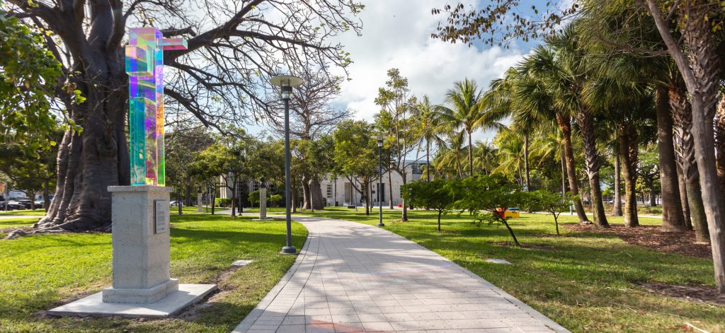 „Your Momma’s Voice in the Back of Your Head“ ist in Reaktion auf einen offenen Aufruf des The Bass Museums in Miami Beach entstanden. 2021 ist das erste Jahr dieser neuen Serie, genannt New Monument, in der das Museum eine Reihe von Fragen anstößt darüber, was ein Denkmal können und/oder sein muss. Ich habe meine Kunstpraxis schon immer als utilitaristisch gesehen. Ich denke, dass Objekte und Bilder, die ich mache, einen praktischen Nutzen haben sollten für mich und/oder die Öffentlichkeit. Dementsprechend hatte ein Projekt rund um Monumente für mich besonders viele Synergien. Denkmäler als Ort dienen zur Katalyse von Erinnerungen. Mein Hauptziel war es, so ehrlich wie möglich über die Unbeständigkeit sowie die Düsterkeit und gleichzeitig Freude von Erinnerungen zu sprechen. Außerdem wollte ich so viele Einstiegspunkte in die Arbeite wie möglich schaffen, so dass das Denkmal nicht nur einer bestimmten Kategorie von Personen dient.