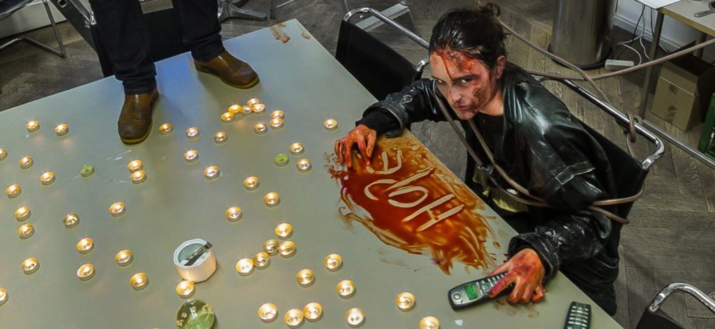 Ursprünglich sollten Barsch und Hornig etwas für den Ausstellungsraum der Uni entwickeln. “Die haben sich wahrscheinlich vorgestellt, dass wir nur etwas in diesem Raum machen. Aber wir haben das ganze Setting der Uni genommen, und zwar mit dem Twist, dass dort eine Zombie-Apokalypse stattfindet”, sagt Paul Barsch. Warum gerade das? “Wir hätten uns auch eine Attentatssituation ausdenken können, aber das wäre zu real gewesen. Wir wollten ein Szenario schaffen, das extrem ist, aber auch so frei wie möglich. Die Zombie-Apokalypse lässt sich filmisch oder theatral denken. Es sieht ja auch absichtlich etwas gestellt aus.“ Fotografiert wurde das ganze mit einer 360° Kamera über einen Zeitraum von einem halben Jahr.