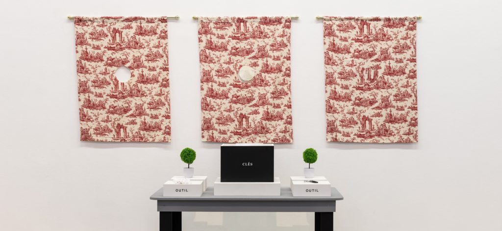„Ich habe über die ‚toile‘ nachgedacht – den gestickten Baumwollstoff. Das ist ein prosaisches Material, das vielfach imitiert wird. Das habe ich als Kind bei Möbeln im französischen Landhausstil beobachtet“, erklärt Green: Textilien, in die pastorale Szenen gestickt sind, die „toiles“, sollen üblicherweise ein altes Europa für den Massenmarkt evozieren. Wenn man bei Greens Variation auf dieser Form näher hinschaut, sieht man die Gewaltszenen, die sie in die idyllischen Landschaften eingefügt hat. Denn die Stoffe tragen eine koloniale Vergangenheit, wie Green in Nantes, Frankreich recherchierte, sie spielten eine Rolle im Transatlantischen Menschenhandel zwischen Europa, Afrika und Nordamerika.