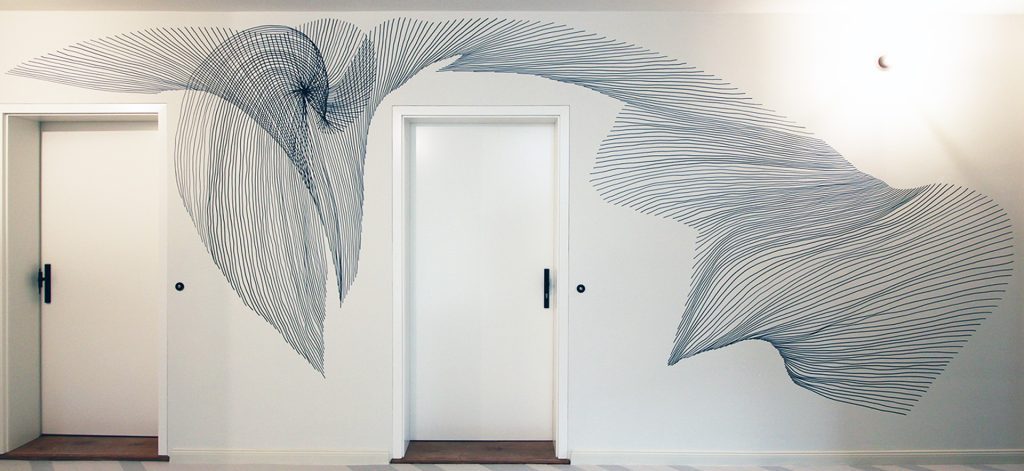 Bei Chois Wandmalereien handelt es sich um Variationen seiner „Linienarbeiten“, wie er sie seit 2010 immer mal wieder in Galerien oder Kunstvereinen ausstellt. Man sieht ein dynamisches Geflecht aus schwarzen Tuschelinien auf weißem Grund, das in seiner Filigranität ein bisschen an Kalligrafie erinnert. „Bei einigen meiner Arbeiten muss ich auch an Einsteins Relativitätstheorie und die schematische Darstellung der Raum-Zeit-Krümmung in Physikbüchern denken“, sagt Choi.