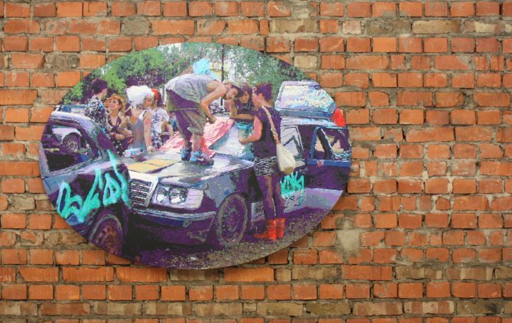In dem großzügigen, rau wirkenden Dachgeschossraum ist viel Malerei zu sehen. Das Berliner Künstlerduo Römer + Römer zeigt sieben teils kleinformatige Bilder aus einer Serie über das alternative „Fusion“-Festival, das jährlich auf einem ehemaligen sowjetischen Militärflughafen in Mecklenburg-Vorpommern stattfindet. Römer + Römer haben vier Jahre in Folge das Festival für elektronische Musik besucht. Das Künstlerduo schoss dort zahlreiche Fotos und übertrug einige anschließend auf Leinwand. Römer + Römer malen, ohne Mischtöne zu verwenden, in einer pointillistischen Manier. Die Gemälde erscheinen aus der Nähe verpixelt und erfordern vom Betrachter einigen Abstand.