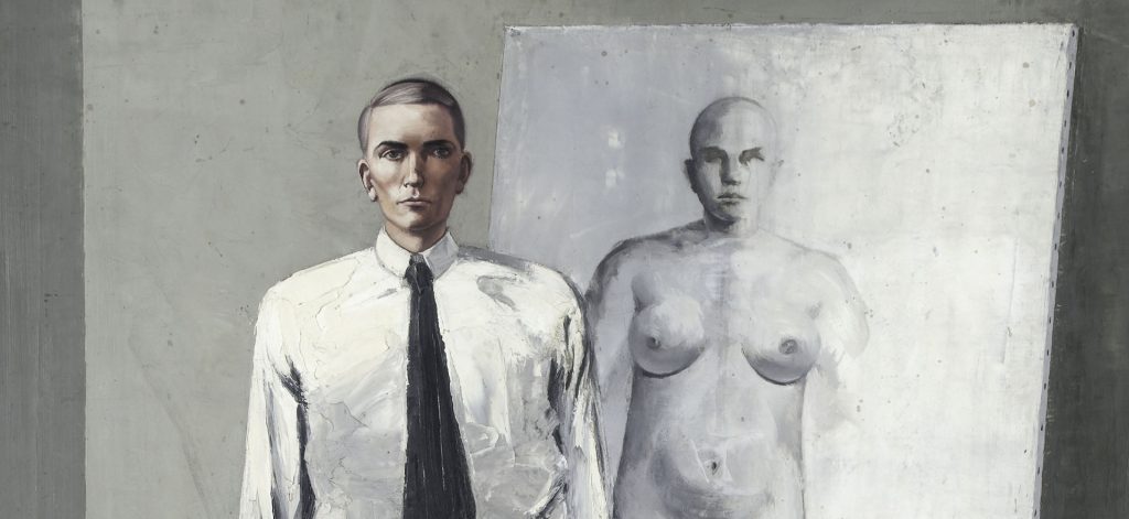 Räderscheidts männliche Figuren wirken, je weiter die zwanziger Jahre voranschreiten, immer selbstbewusster. 1928 malt er das „Selbstbildnis“, das in der Schirn-Ausstellung „Glanz und Elend der Weimarer Republik“ zu sehen ist. Es zeigt den Künstler in einem kahl wirkenden, nicht weiter ausformulierten Raum. Vermutlich ist es Räderscheidts Atelier. Der Mann trägt eine messerscharf gebügelte Hose, Lackschuhe, weißes Hemd und Krawatte. Er macht einen entschlossenen Eindruck. In seiner rechten Hand hält der Mann einen Stift. Hinter ihm steht eine großformatige Leinwand, an die Wand angelehnt. Darauf zeichnet sich eine weibliche Aktfigur ab.
