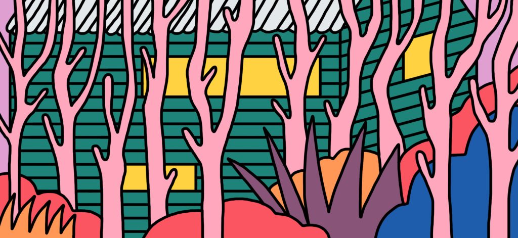 Ich schaue mir die Fotos von seinem Studio an und sehe ein Gebäude, mit mintgrünen Latten verkleidet, aus verschiedenen Blickwinkeln fotografiert. Die Bäume auf den Bildern haben keine Blätter und die schmalen Fensterbänder sind von innen beleuchtet. Auf einem Bild ist das freistehende Gebäude aus der Ferne fotografiert zu sehen, durch Bäume und Gebüsch hindurch. Im Vordergrund Grabsteine. Die stehen in seltsamen Kontrast zu dem einladenden Haus und geben der Szenerie etwas Morbides, wie man es aus den Schauergeschichten von H.P. Lovecraft kennt.
