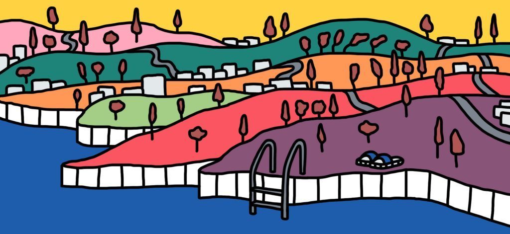 „Alaçatı“, sage ich, scheitere aber an der korrekten Aussprache. Nicht weit entfernt von der Küste ist die Stelle der Ägäis, an der Ikarus dem Mythos nach ins Meer gefallen und ertrunken ist. „Was machst du in dem Dorf?“, frage ich. Ayşe Erkmen verbringt schon lange ihre Ferien in einem bestimmten Hotel. Dort wird keine Musik gespielt. Keine Kellner bedienen die Gäste. Aber es gibt einen Pool — Erkmen: „Ich mag Swimming Pools sehr, diese künstlichen Wasserflächen“ — Bäume und einen Strand, sonst nichts. Die Menschen lesen dort die meiste Zeit.