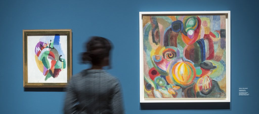 Sonia Delaunay, aufgewachsen in St. Petersburg und verheiratet mit dem französischen Maler Robert Delaunay, war eine kreative Pionierin mit Geschäftssinn, ein kompromissloser Freigeist. Sie war der Überzeugung, dass die Erfahrung von Kunst nicht an Orte wie das Atelier oder den Ausstellungsraum gebunden bleiben, sondern in alle Phasen und Bereiche des Lebens integriert werden soll. So tanzte sie leichtfüßig durch die Disziplinen und verwirklichte ihre Vision in Malerei, Mode, Textildesigns, Filmsets wie Theaterkostümen und entwarf Motive für Autos, Spielkarten, Badeanzüge. Sogar eine Neonskulptur kreiert sie, womöglich die erste ihrer Art. Um den von Geschwindigkeit und Mechanisierung geprägten Rhythmus der modernen Welt auszudrücken, setzte sie immer wieder auf das dynamische Zusammenspiel von Dissonanz und Harmonie, von Form und Farbe. Und immer wieder Farbe.