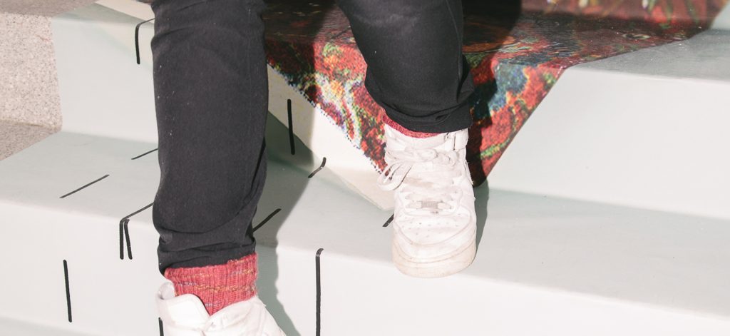 Das Material von Pia Ferms Arbeiten lässt keinen Zweifel offen. Es stellt sich jedoch die Frage, ob man hierbei eher von einem Bild oder einer Skulptur sprechen würde. Pia Ferm präsentiert an beiden Standorten der Städelschule Wandteppiche aus Wolle, die aufgrund ihrer Farbigkeit und ihres gestischen Ausdrucks vielmehr an Malerei denken lassen. Insbesondere in ihrer Arbeit „still life“ kommt dies zum Ausdruck, in der sie ein Stillleben aus Früchten und einer Weinflasche dargestellt hat.