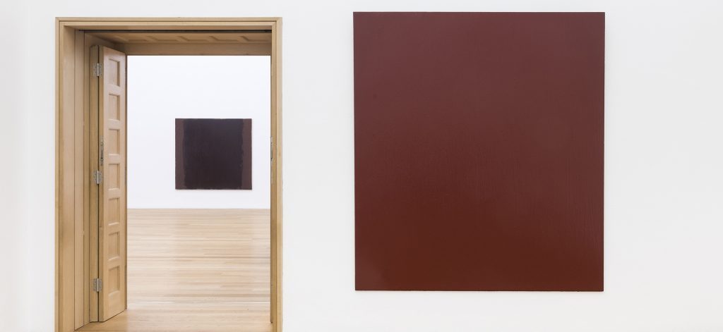 Und noch eine andere, viel aktuellere Rückführung feiert das Museum Wiesbaden an diesem sonnigen 28. Juni: Nach langjährigen Bauarbeiten kann heute die große Freitreppe vor dem Museum wieder in Betrieb genommen werden und die von dem Münchener Bildhauer Hermann Hahn geschaffene Goethe-Statue findet ihren alten Platz auf den obersten Stufen des Treppenabsatzes. Während draußen zu Füßen Goethes noch das alljährliche Sommerfest des Museums begangen wird, herrscht drinnen in den Ausstellungsräumen nüchterne Klarheit. Die Malerei spricht hier für sich, was Joseph Marioni noch einmal betont, wenn er die Besucher vor dem Betreten der Ausstellung auffordert: „Let the Paintings be Paintings.“
