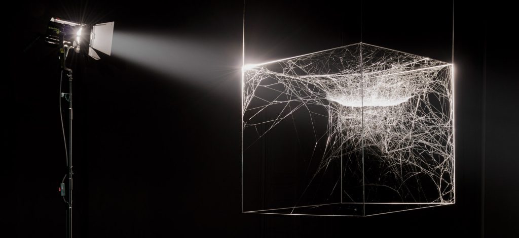 Der Raum ist dunkel. In einer von einem Scheinwerfer beleuchteten Vitrine erblickt man ein filigranes Werk aus Fäden. Sie wirken so, als würden sie schweben, diese Fäden. Mal sind sie eng verwoben, mal ist das Muster weiter gefasst. Sie formen Wattebäusche, sie bilden Wolken. Steht man direkt davor, erinnert das, was man sieht, an Schwarzweißfotografien von Schneetreiben. Es sind Skulpturen, bei denen man in jedem Moment denkt, sie könnten gleich zerfallen.