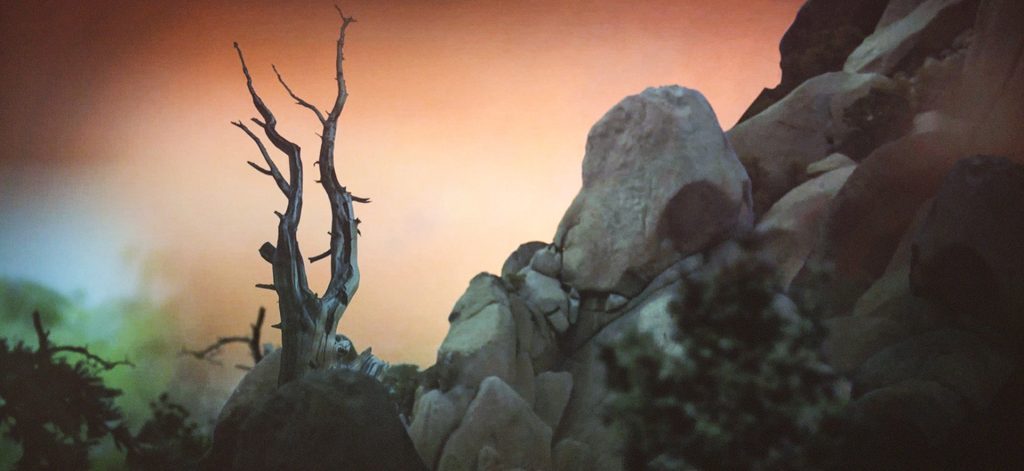 Doch zurück zur Ausstellung: Im Vorgarten trällern die Vögel seltsam vor sich hin und ziehen einen schier automatisch an. Die Eingangstür aufgemacht, steht man prompt in einer Hütte. Und da geht es ja schon los. Handelt es sich hierbei um einen Schutzraum, oder doch um eine verwunschene, vielleicht sogar bedrohliche Baracke? Durch die Fenster der Hütte wird der Wald noch aus sicherer Entfernung betrachtet. Da sieht man direkt hinein in die Natur: einerseits wie sich die Äste im Wind wiegen und andererseits wie als Tiere verkleidete Menschen durch den Wald spazieren, in einem Bergsee planschen und vor sich hin philosophieren.