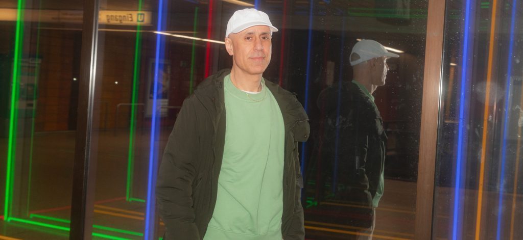 Die Zeiger der quadratischen Bahnhofsuhr über unseren Köpfen gehen falsch und auch sonst wirkt es ein bisschen so, als sei die Zeit stehengeblieben: Das Ambiente der B-Ebene der U-Bahn-Station Höhenstraße hat definitiv Retro-Charme. Mit Murat Güngör, der gleich um die Ecke wohnt, sind wir hier vor einem Kunstwerk mit dem Titel „Unendlichkeitssimulator“ verabredet. Volker Bussmann hat es 1980 geschaffen. Die Installation besteht aus Neonröhren und Spiegeln und würde sich auch in einem Club gut machen. Kein Wunder, dass sie bis heute gerne als Hintergrund für Tanz-Performances genutzt wird – wie es zum Beispiel Videos auf TikTok beweisen. „Früher hat sich auf dem Platz direkt davor die Breakdance-Szene getroffen“, erzählt Güngör. „Wenn die Hauptwache die Bühne war, dann war das hier der Proberaum.“ Mitte der Achtziger hat er auch mal Breakdance gemacht. Aber nur kurz.
