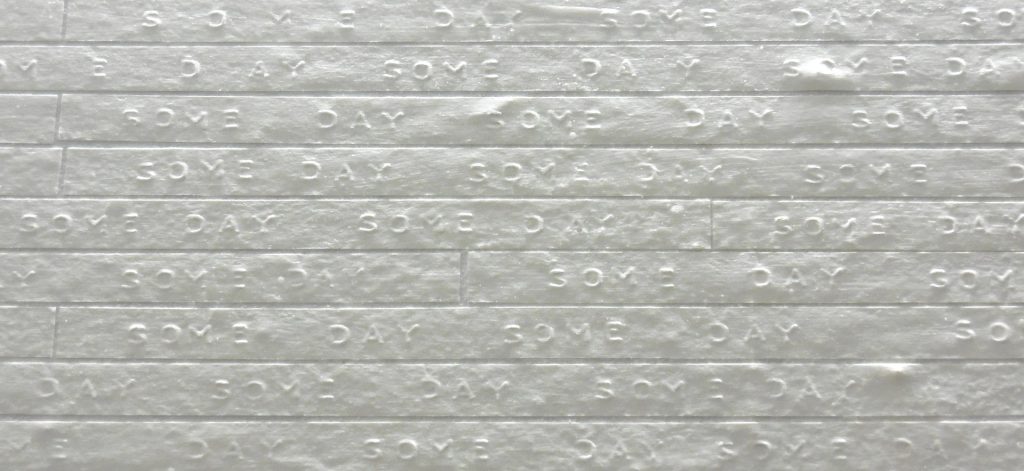 „It will“ / „Be good“ / „Some day“ – Wir alle hoffen, dass es eines Tages gut wird. Der Satz, der eine Behauptung, einen Wunsch und eine Sehnsucht ausdrückt, ist Ausgangspunkt für die Installation „Mantra I“ von Jennifer Nastanovich. Sie besteht aus drei großformatigen, bemalten Leinwänden, die mit unzähligen Papierstreifen beklebt sind. Nastanovich hat mit einem Handprägegerät, mit dem früher Namensschilder hergestellt wurden, die drei Satzfragmente in monatelanger Arbeit, Buchstabe für Buchstabe, auf weißes Papier aufgetragen.