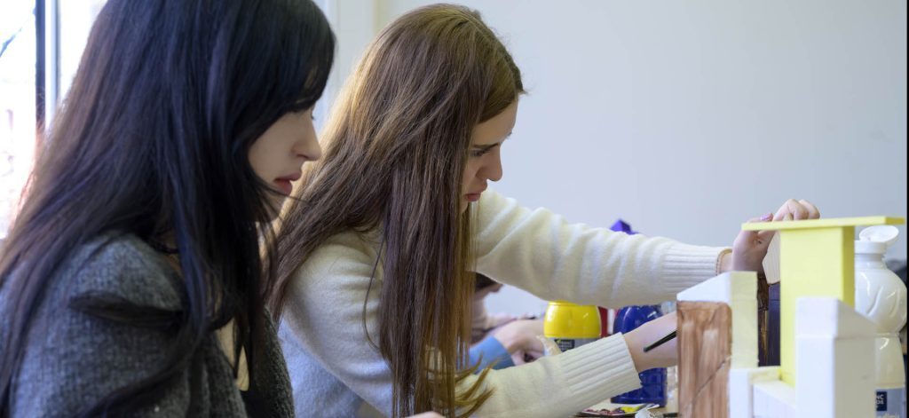 Die Collage für die weitere Werkserie in eine dreidimensionale Struktur aus Holz zu übertragen, empfanden die Jugendlichen zunächst als Herausforderung. Während Alexa sich für ihre Holzarbeit stärker vom Originalmotiv entfernte und die Spitzen der Hochhäuser nach links versetzte, verband Marianna das Scherbenmotiv ihrer Collage mit den Impressionen von Wolkenkratzern aus der Ausstellung – die abstrakten Formen finden sich in der Holzarbeit als Teil einer Hochhauskonstruktion wieder. Es sei wie ein Puzzle gewesen, beschreibt sie den Arbeitsprozess. Angeregt durch die Architekturen Feiningers habe sie sich gefragt, welche Gebäude ihr in Frankfurt gefallen. Die Antwort darauf, waren die Hochhäuser. Auch Taras griff für die Holzarbeit das Motiv des Hauses auf, doch wichtiger als die Höhe der Häuser ist ihm die Funktion: Es sei ein Wohnhaus für die ganze Familie, für seine Eltern und fünf Geschwister, das er in der Holzstruktur umgesetzt habe, erzählt er.