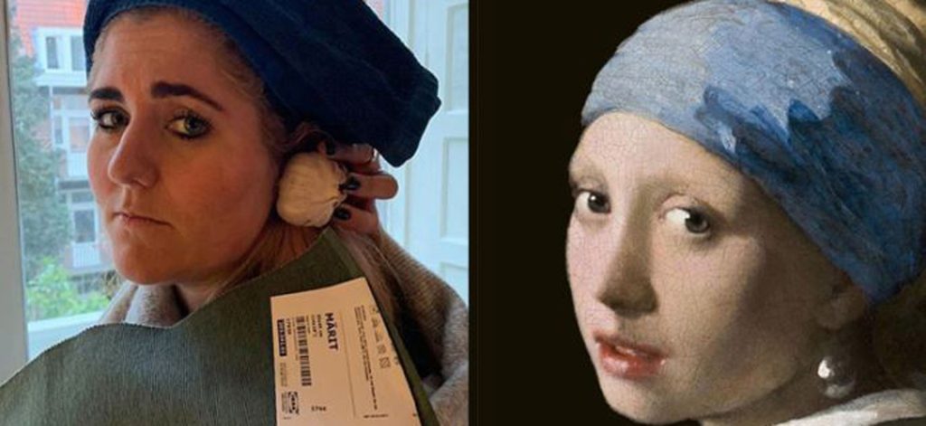 Es begann am 14. März 2020 mit einer Knolle Knoblauch, einem Tischläufer und einem Tuch. Und ist heute mit fast 250.000 Followern bei Instagram und 42.000 Beiträgen unter dem gleichnamigen Hashtag das Musterbeispiel für einen viralen Selbstläufer: Tussen Kunst en Quarantaine (Zwischen Kunst und Quarantäne). Seit eineinhalb Monaten ist der Instagramkanal online, der als zufällige Idee im Homeoffice der Amsterdamerinnen Anneloes Officier und Floor de Weger entstand. Das Prinzip ist denkbar einfach: Man wählt ein Kunstwerk aus, nimmt sich drei Dinge zur Hand, die man sowieso in seinem Haushalt hat, und stellt damit das gewählte Werk nach.