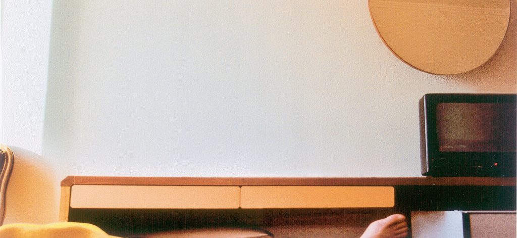 In der aktuellen Ausstellung „ICH“ sind zwei Inkjet-Fotoprints von Eberhard Havekost zu sehen, die ein Fragment aus dem nomadischen Leben eines erfolgreichen Künstlers festhalten. Die beiden kleinformatigen Blätter heißen „Hotel“. Sie sind 2003 entstanden. Die typische, neutral-anonyme Hoteleinrichtung steht im Mittelpunkt der Fotografien. Am unteren Bildrand taucht einmal ein blanker Fuß auf, einmal ist ein Stück Knie zu sehen. Die abgebildete, sich selbst abbildende Person ist nur bedingt zu sehen. Der Verweis darauf ist so minimal wie nur möglich. Er reicht jedoch aus, um Präsenz zu suggerieren.